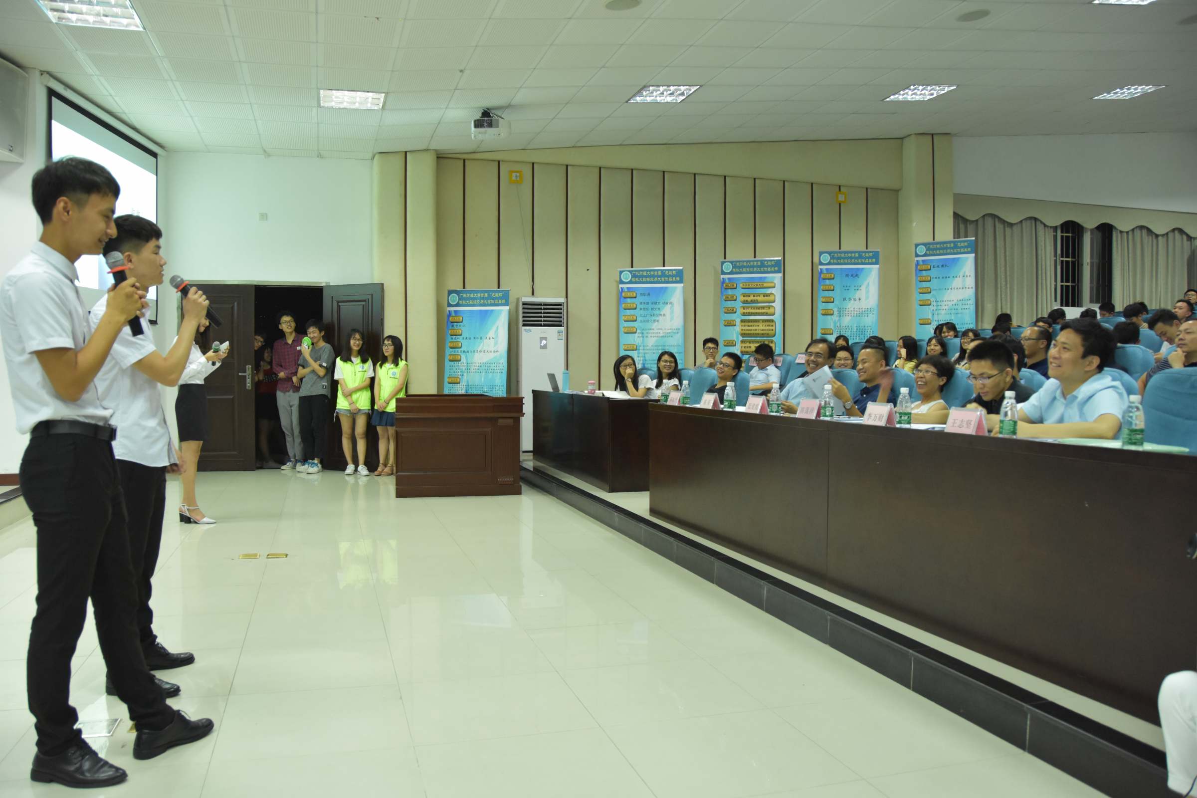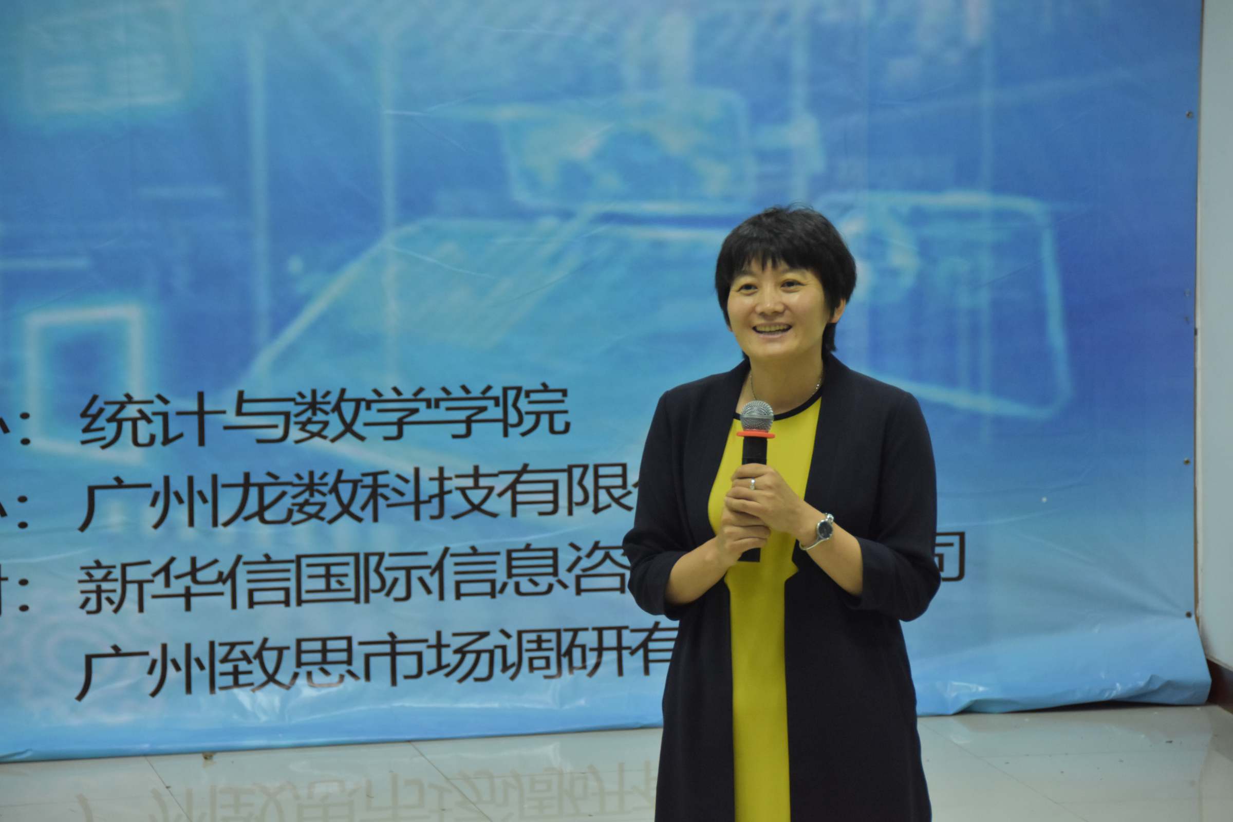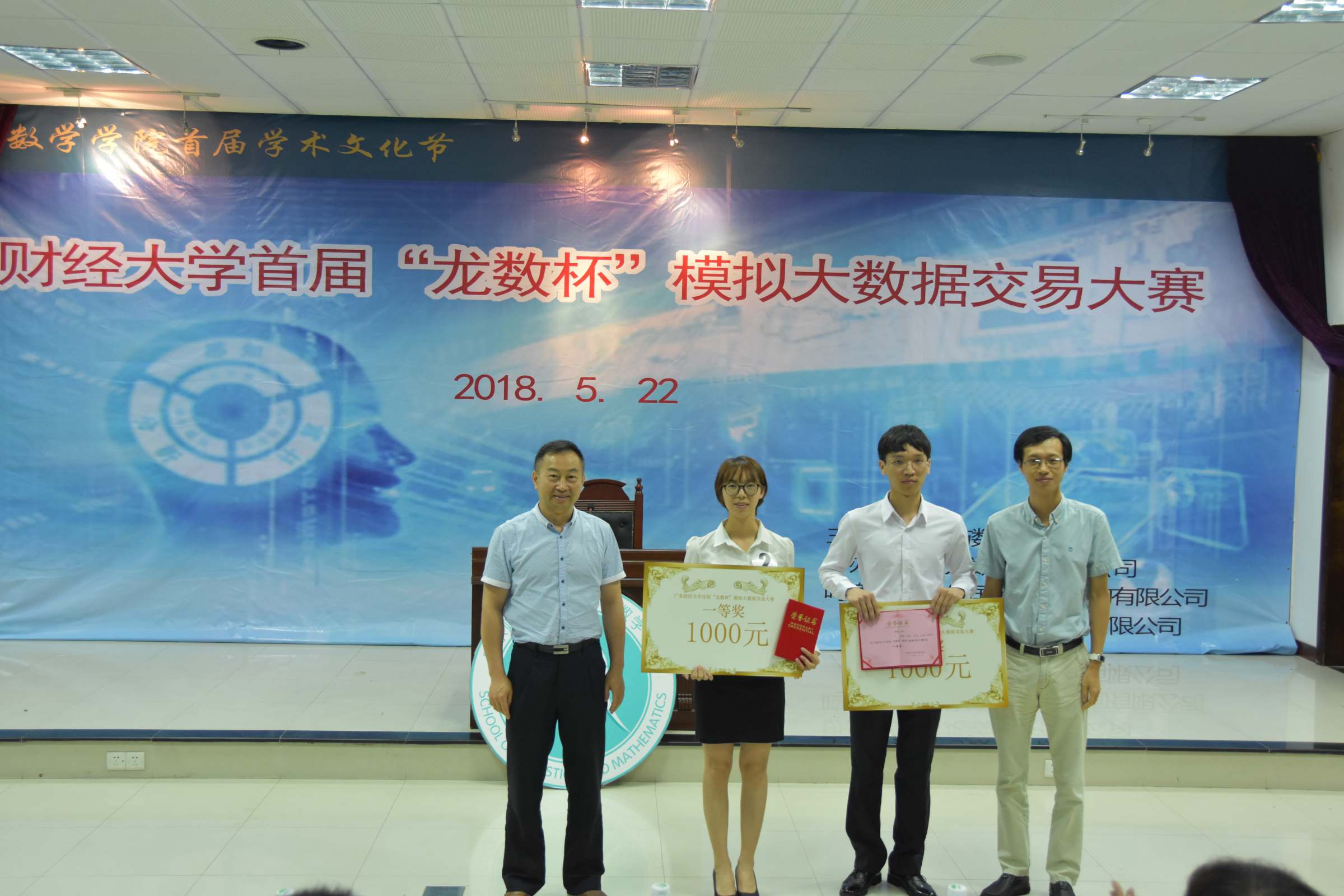 5月22日晚上,统计与数学学院在我校广州校区模拟法庭举办首届“龙数杯”模拟大数据交易大赛。广州龙数科技有限公司总监李万财,广州致思市场调研有限公司总监陈荣,我校统数学院副院长陈蔼祥,老师陈冰川、王志坚等担任本次大赛评委。广州龙数科技有限公司总经理吴锐彬、广东产权交易集团首席信息官谢江涛、广州恒电科技信息股份有限公司董事长高静、万和证券广州分公司总经理韩泽昀校友、学院党委书记王伟、副院长黄辉、学院党委副书记李恩华等出席本次大赛,学院全体辅导员和部分学生共130多人参加了本次大赛。