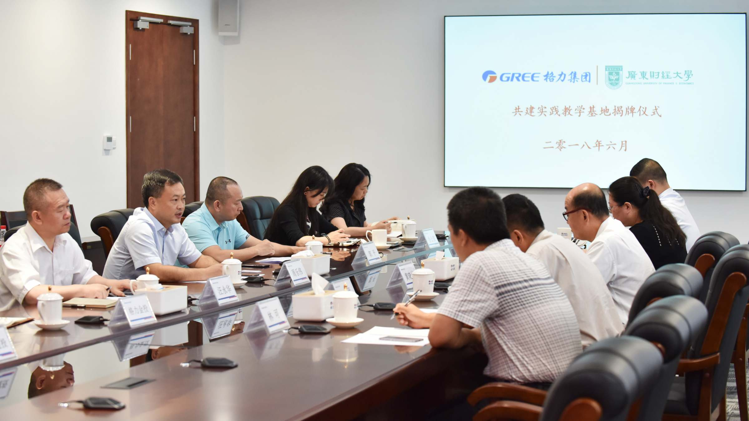 周乐伟和黄晓波分别讲话。周乐伟感谢母校对格力集团的肯定和厚爱,他介绍了格力集团的的发展情况。黄晓波对格力集团对我校的支持表示感谢,并介绍了我校的办学历史沿革及特色理念等。随后黄晓波和周乐伟为广东财经大学与珠海格力集团共建实践教学基地揭牌。揭牌仪式结束后,双方就实习基地的建设、学生实习就业、企业培训及教育资源合作等进行交流。
