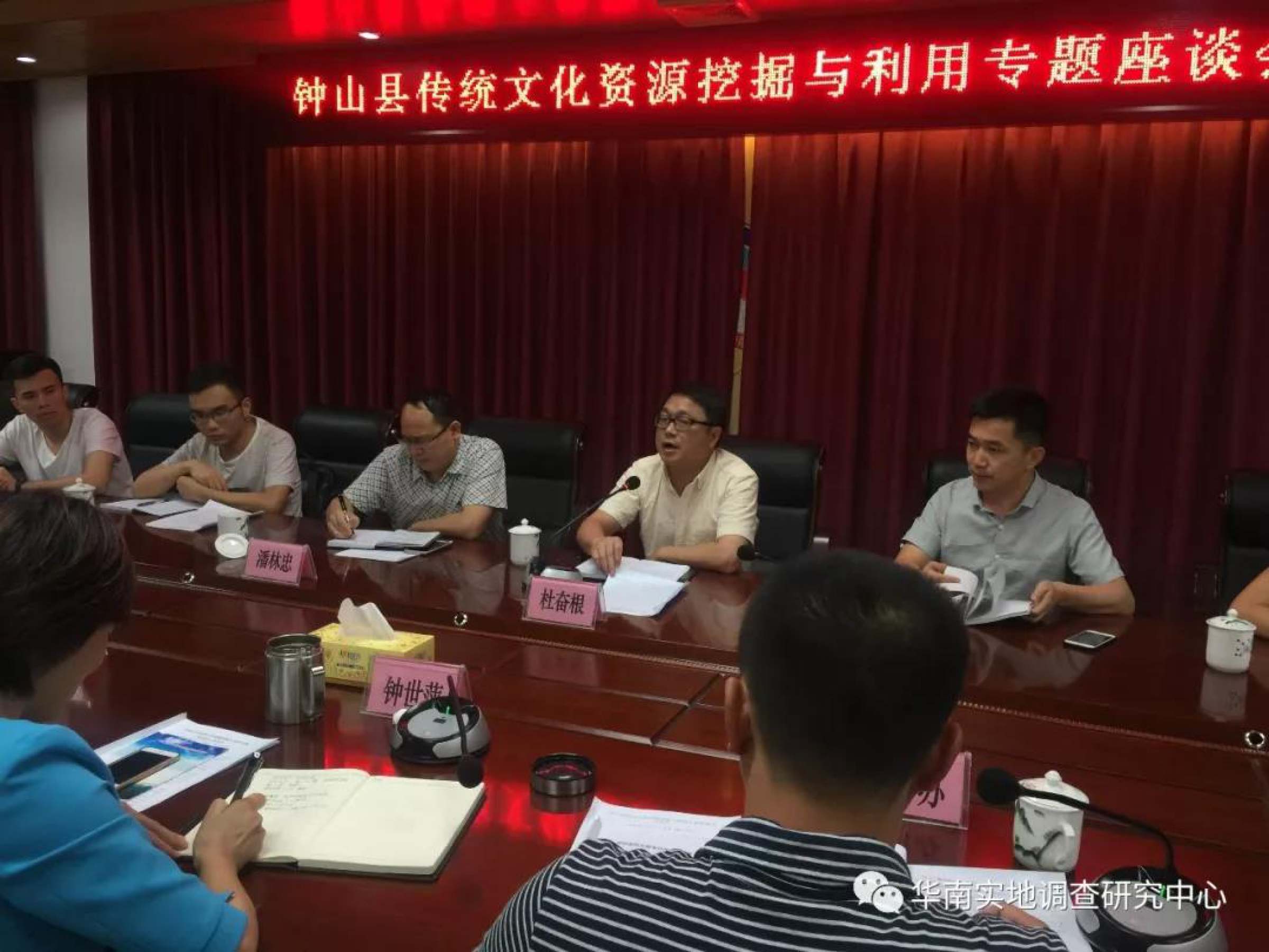 钟山县的调研主题为文化振兴。8月26日,在钟山县委常委、宣传部部长钟世萍等的陪同下,调研组参观了石龙古桥、龙道村、公安镇大田村古戏台等文化古迹,县文管所所长陈晓林陪同做了详细解说。之后调研组来到钟山县大坪宝庆瑶寨,举行了广东财经大学华南实地调查研究中心大坪瑶寨研究基地的挂牌仪式。大坪瑶寨村民还为调研组举办了具有民族文化特色的欢迎仪式。8月27日,钟世萍主持召开了钟山县传统文化资源挖掘与利用座谈会。她对钟山县文化资源的发展现状进行了系统介绍,并希望调研组能够为钟山县文化发展提出好的建议。王朝辉和杜奋根就钟山县的具体情况对优秀传统文化的整合、挖掘提出了意见,并表示要对钟山县文化振兴工作进行更加全面的梳理,从而推动钟山县文化资源整合与文化振兴。