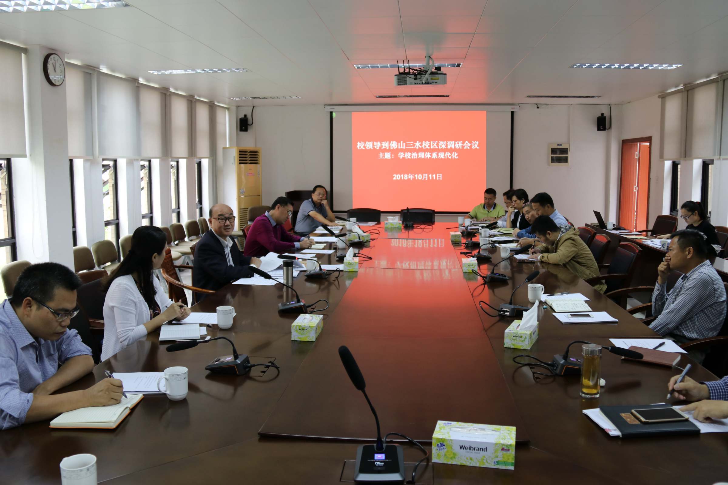 为进一步推动佛山三水校区落实(下称“校区”)《广东省加强党的基层组织建设三年行动计划(2018—2020年)》(下称《三年行动计划》)及开展深调研工作,校党委书记黄晓波于10月11日到校区开展督导和调研工作。校区党委委员、全体教工党支部书记、学生党支部书记及党办校办相关工作人员参加督导会。校区管委会班子成员及各部门负责人,国际商学院、文化创意与旅游学院负责人及教师代表,佛山现代服务业研究院、研究生院佛山分院负责人及党办校办相关工作人员参加了主题为“学校治理体系现代化”深调研会议。
