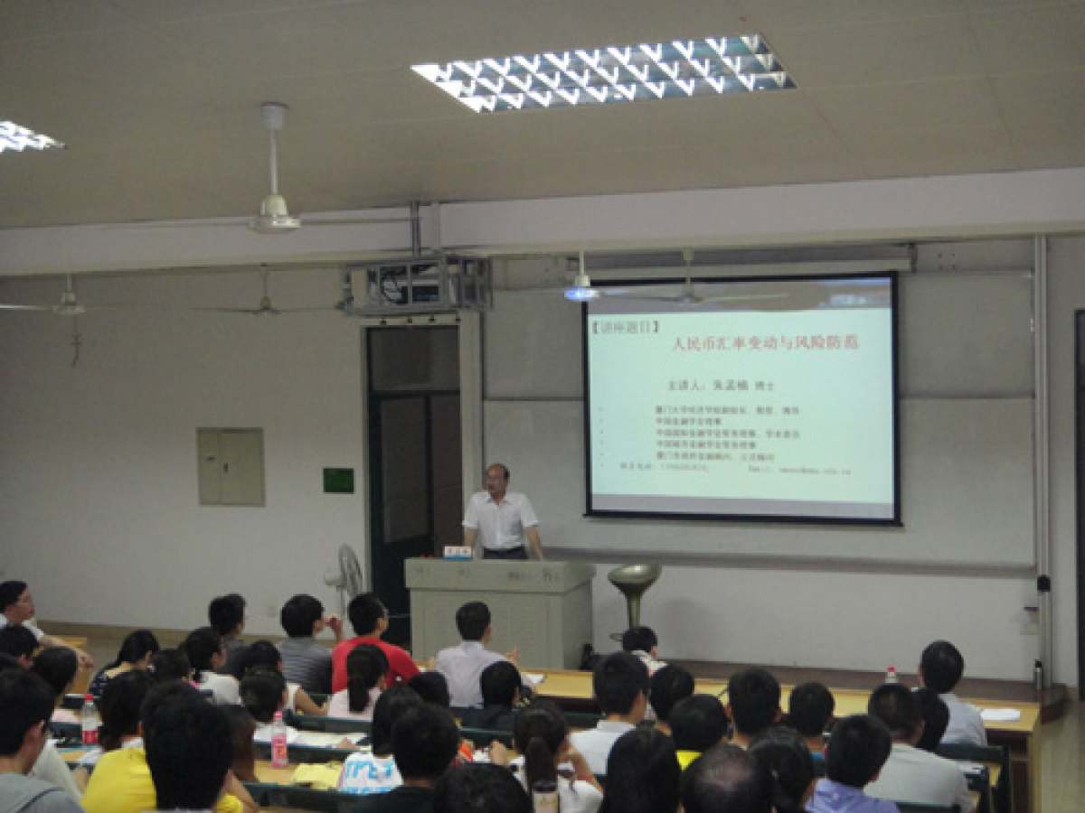 9 月 10 日晚,厦门大学经济学院副院长、博士生导师朱孟楠教授在综合楼 203 作题为“人民币汇率变动与风险防范”的讲座。金融学院院长邹新月、副院长刘湘云,金融学院研究生等到场。