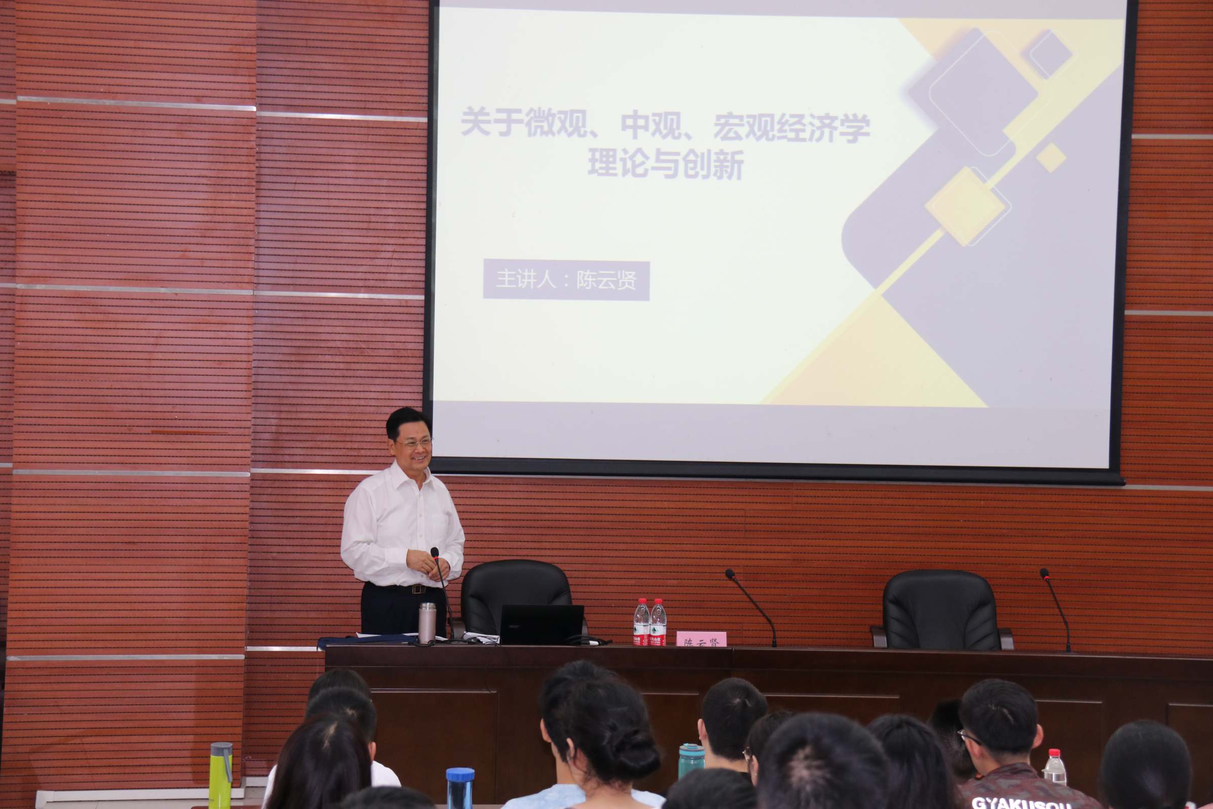 10月23日下午,广东省原副省长陈云贤博士来校主讲研究生名师名家课程《中观经济学》,校长于海峰,研究生院、工商管理学院相关领导和老师,选课研究生共100余人聆听讲课。