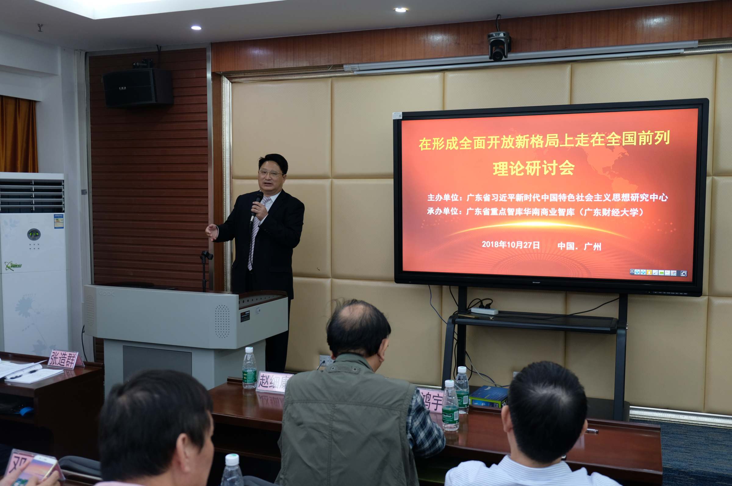 10月27日,由广东省习近平新时代中国特色社会主义思想研究中心主办、广东省重点智库华南商业智库(广东财经大学)承办的“在形成全面开放新格局上走在全国前列”理论研讨会在我校召开。来自广东高校、科研机构、政府机构、行业协会、工商企业、新闻媒体的近80名代表出席会议。会议由我校商贸流通研究院院长王先庆主持,广东省社会科学院副院长赵细康代表主办方致辞,广东财经大学副校长邹新月代表承办方致辞并做主题发言。