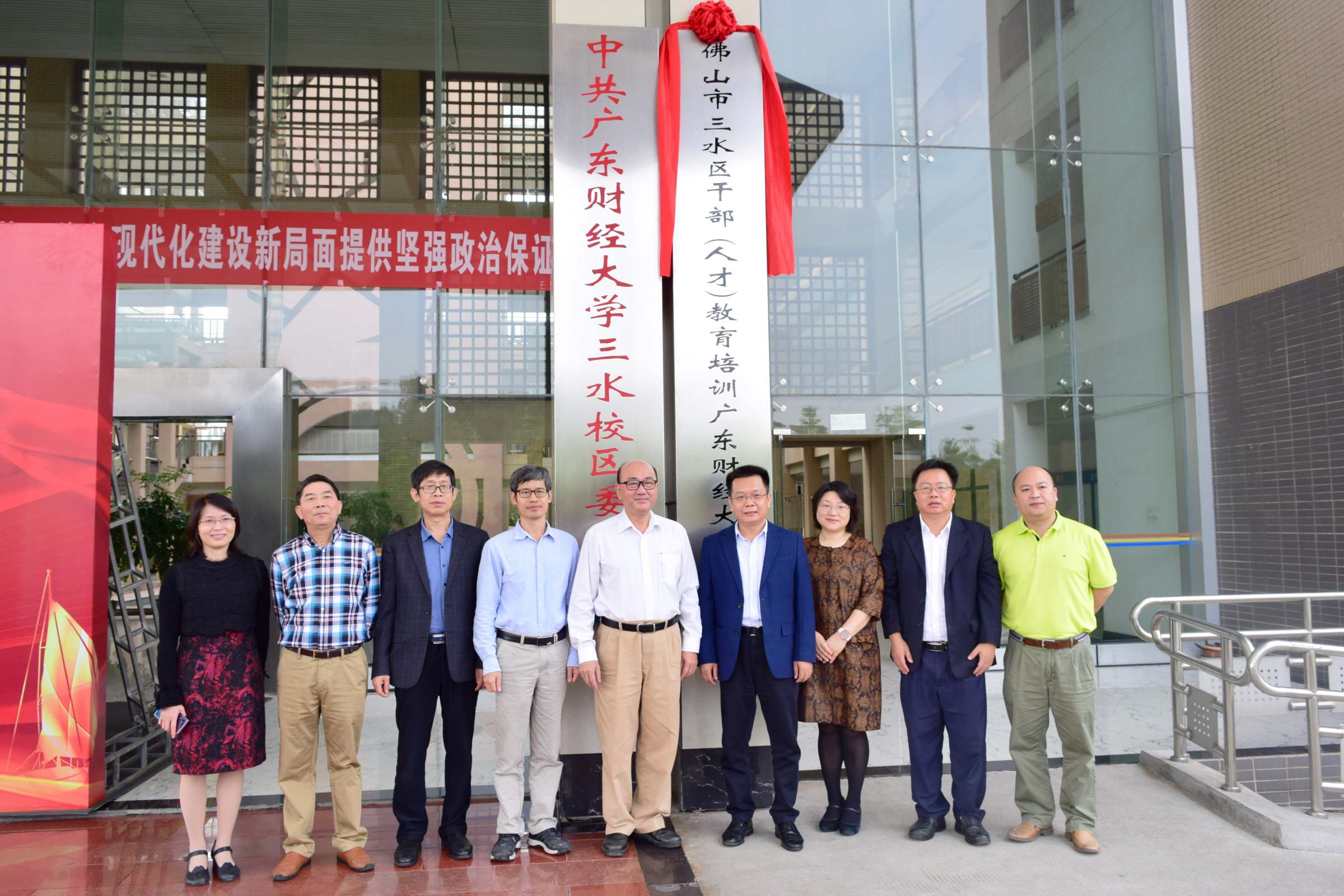 廖义斌、谢访春代表双方签署了“合作共建框架协议”。签约结束后,廖义斌、胡英、黄晓波、邓惠毅共同为“佛山市三水区干部(人才)教育培训——广东财经大学基地”揭牌。