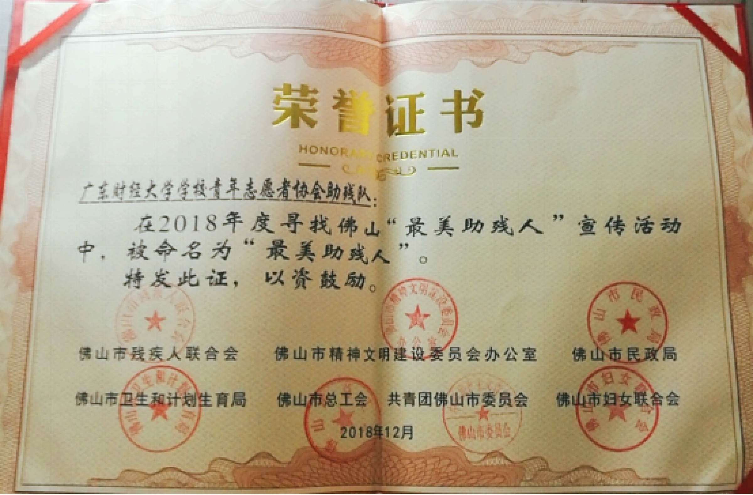 近日,以“残健同心 共筑中国梦”为主题的广东省第八届残疾人文化节闭幕式暨佛山“最美助残人”名单发布仪式在佛山金马剧院举行,共有10个组织和10名个人获得佛山“最美助残人”称号。我校青年志愿者协会佛山三水校区执委会助残队喜获表彰,也是此次获奖单位中唯一一个来自学校系统的团队。