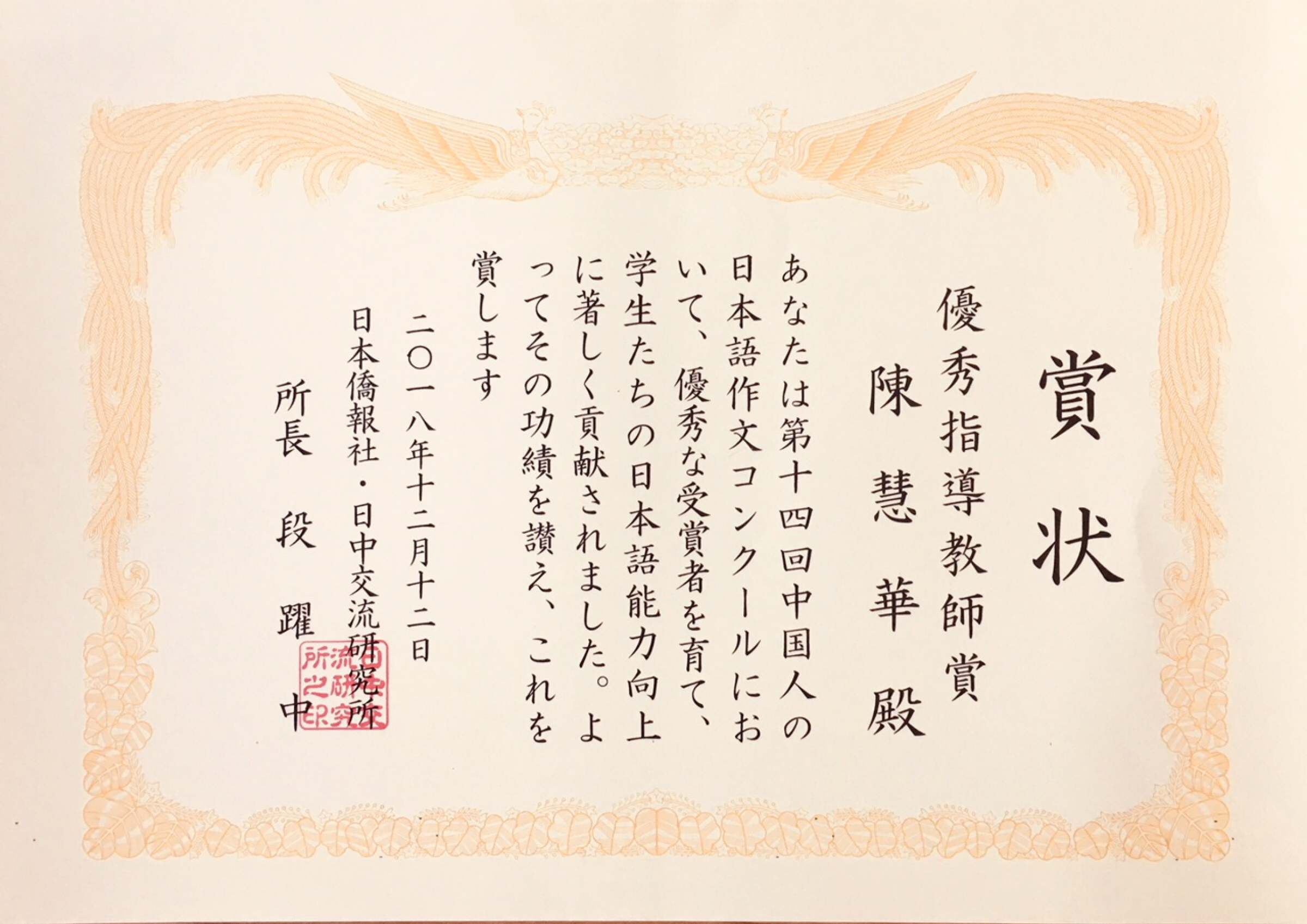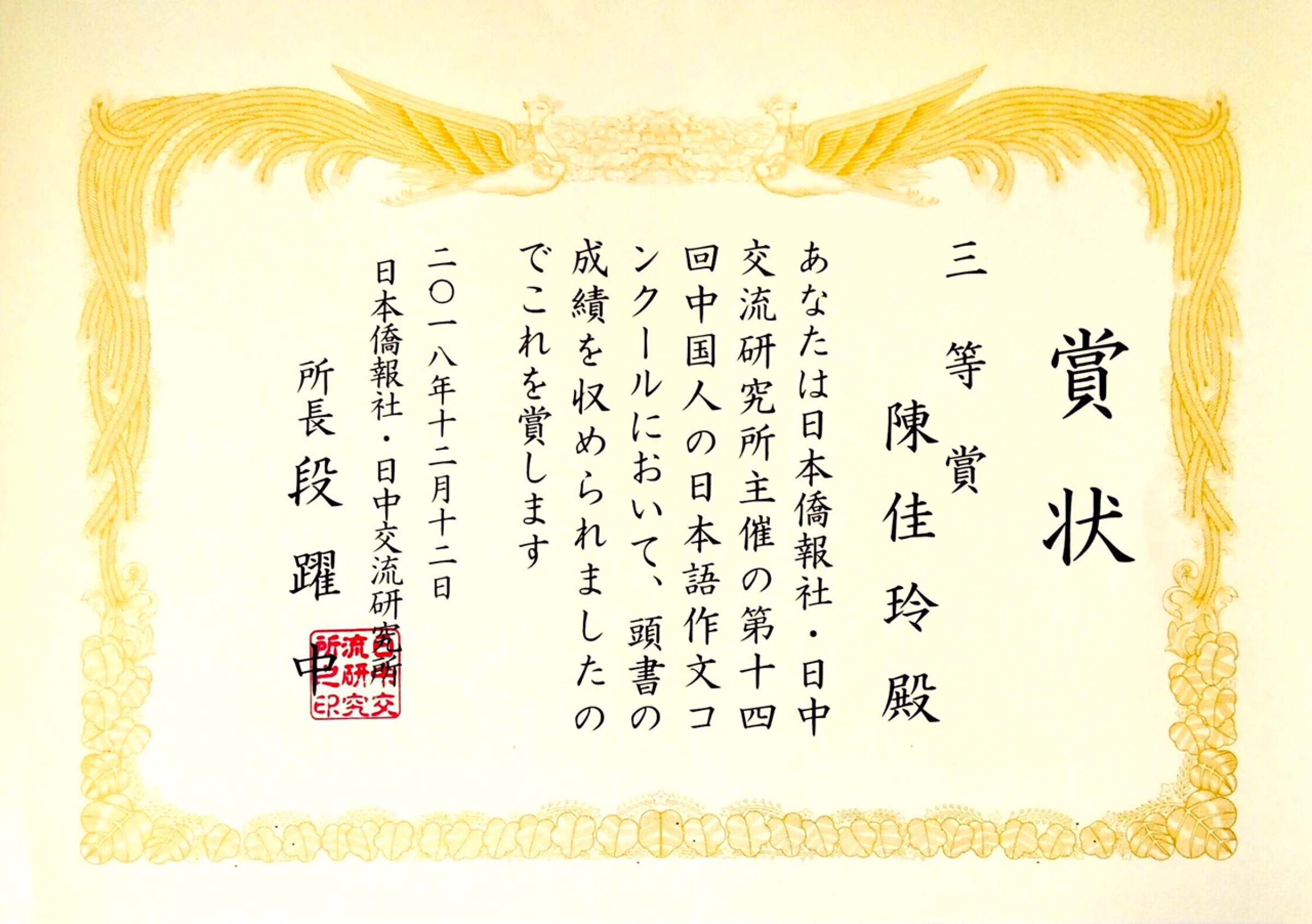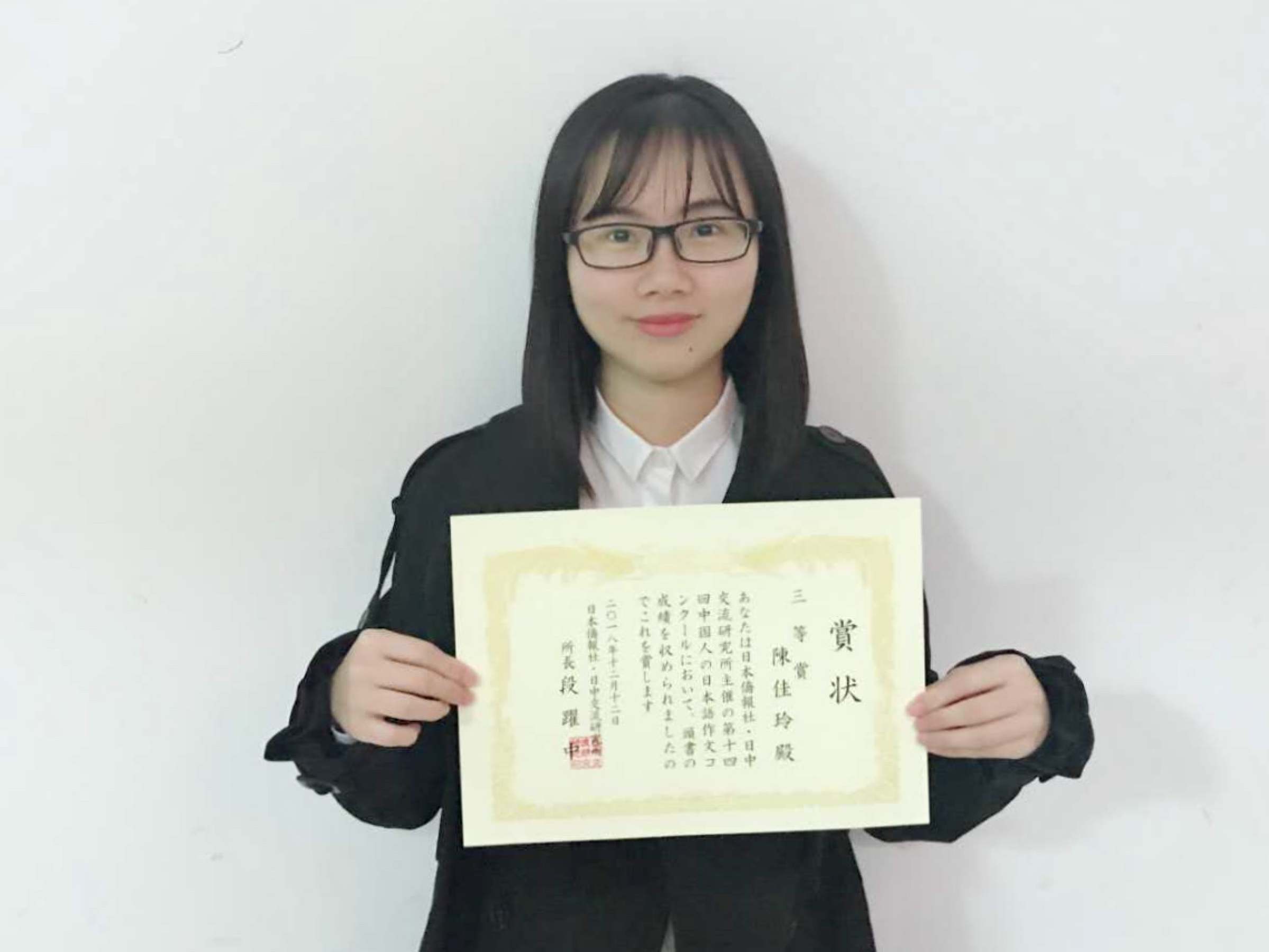 12月12日,“全中国日语作文大赛”(中国人の日本語作文コンクール)颁奖典礼及获奖文集首发式暨日语演讲大会在北京日本驻中国大使馆举行。我校2015级学生陈佳玲的作文“留在心中的老师的那句话“获全国三等奖,陈慧华老师获优秀指导教师奖。日本国驻华大使馆横井裕大使为获奖者颁奖。