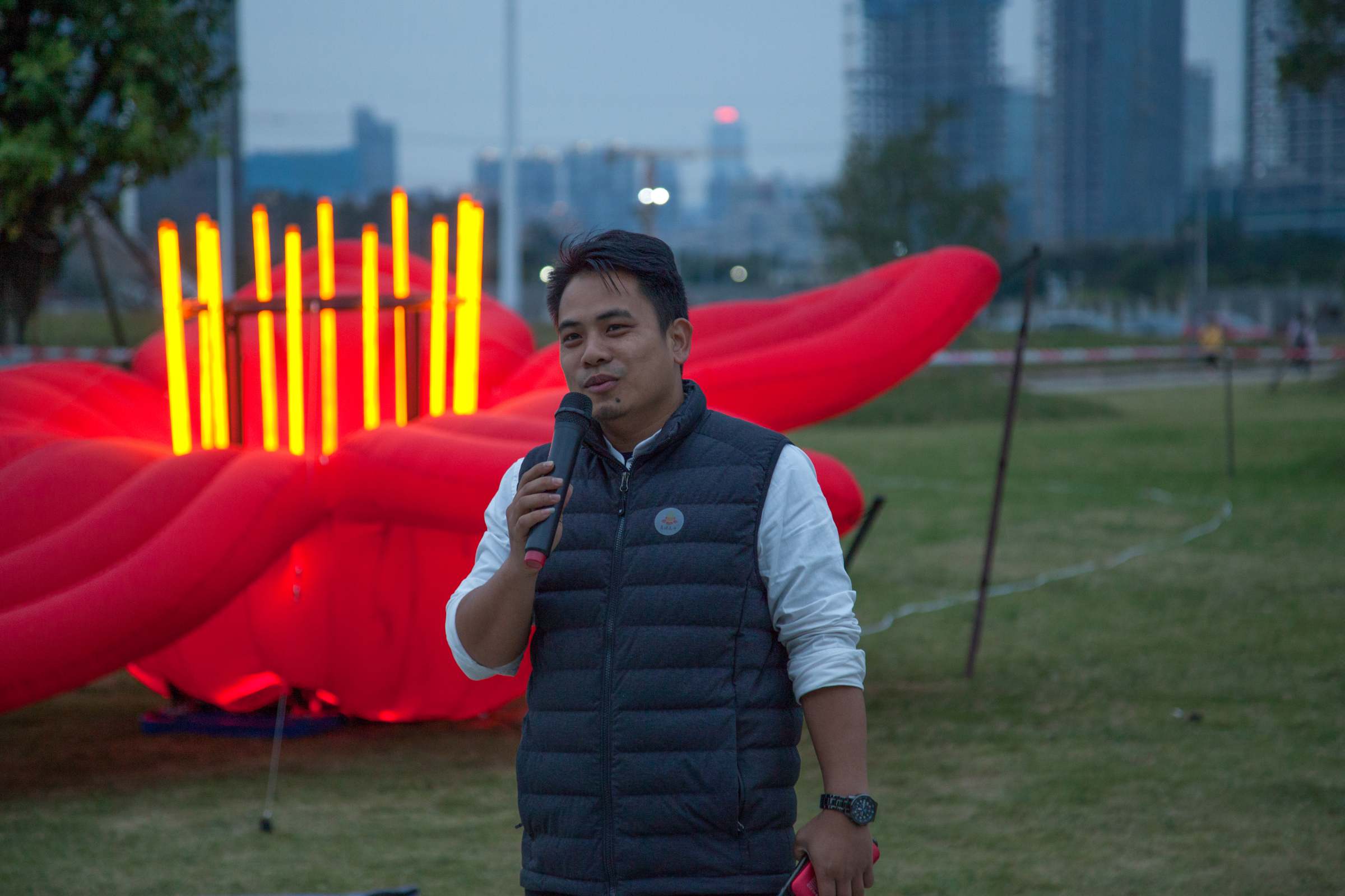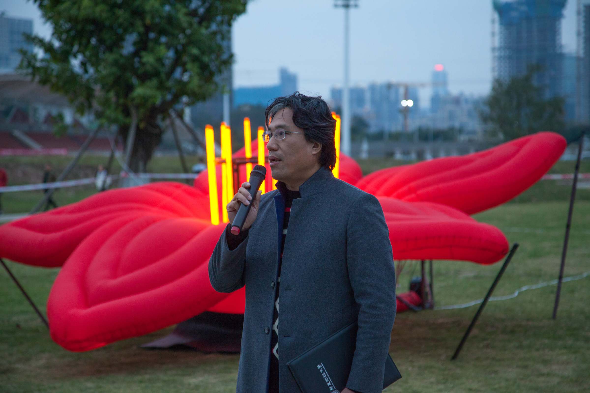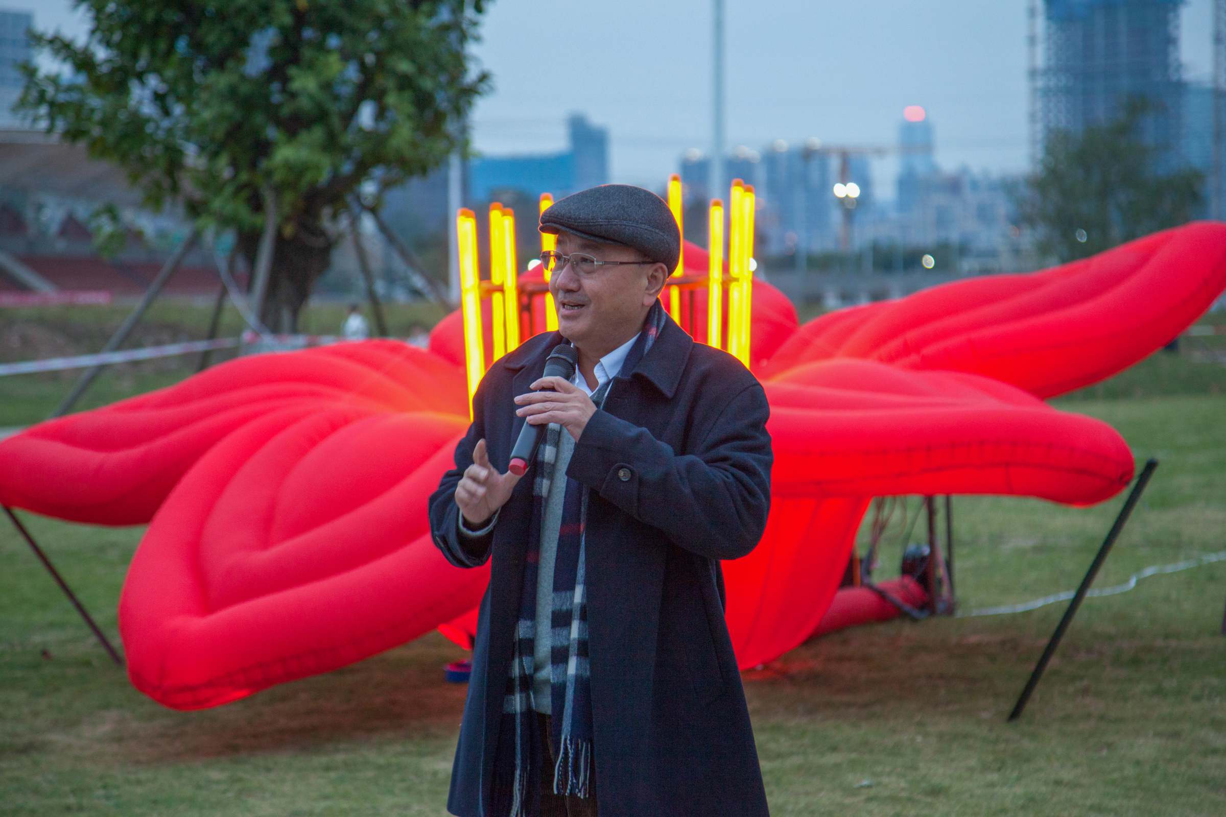 《花城花开》作品执行总监梁羡荣讲话。他说,《花城花开》于2018年广州国际灯光节在花城广场展出一周,得到社会好评,又能得到学校支持,回校向师生展览,十分难得,希望各领导、师生对作品多做指教。他表示,作品设计团队将不忘初心,继续前行,服务学校,服务社会。