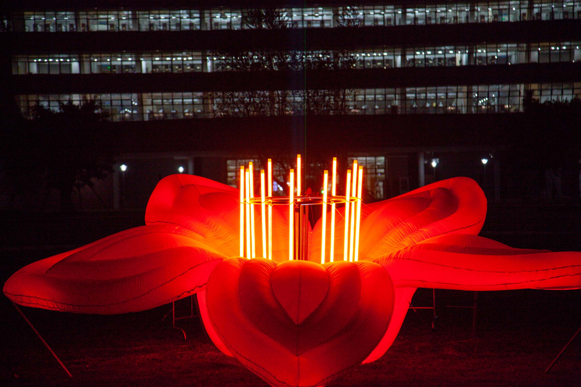 12月28日下午5时30分,2018广州国际灯光节作品《花城花开》回校展览亮灯仪式在北校区图书馆前草坪南侧举行。校党委书记黄晓波,副校长王廷惠、陈国栋,学校各单位负责人、其他学院领导,艺术与设计学院作品设计团队参加仪式。黄晓波、王廷惠、陈国栋等为作品亮灯。艺术与设计学院院长杜肇铭主持仪式。