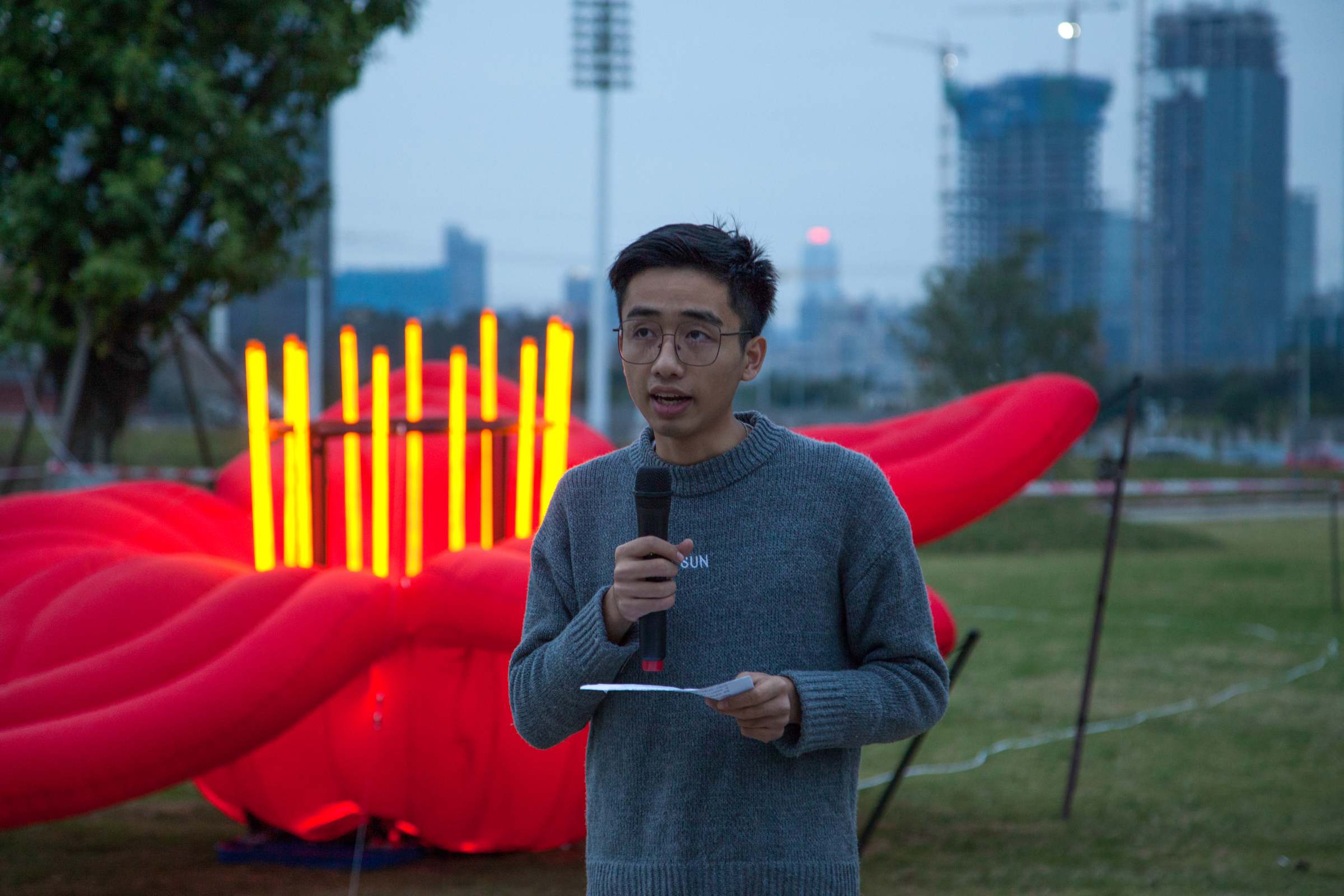 《花城花开》作品主创团队学生代表杨文深发言。他说,虽然设计和创作的日子很辛苦,但也获得了很多收获。他为团队设计出这样的作品而感到骄傲,为能够代表学校参与广州国际灯光节感到荣幸。他表示要努力学习,增长本领,回报母校,服务社会。