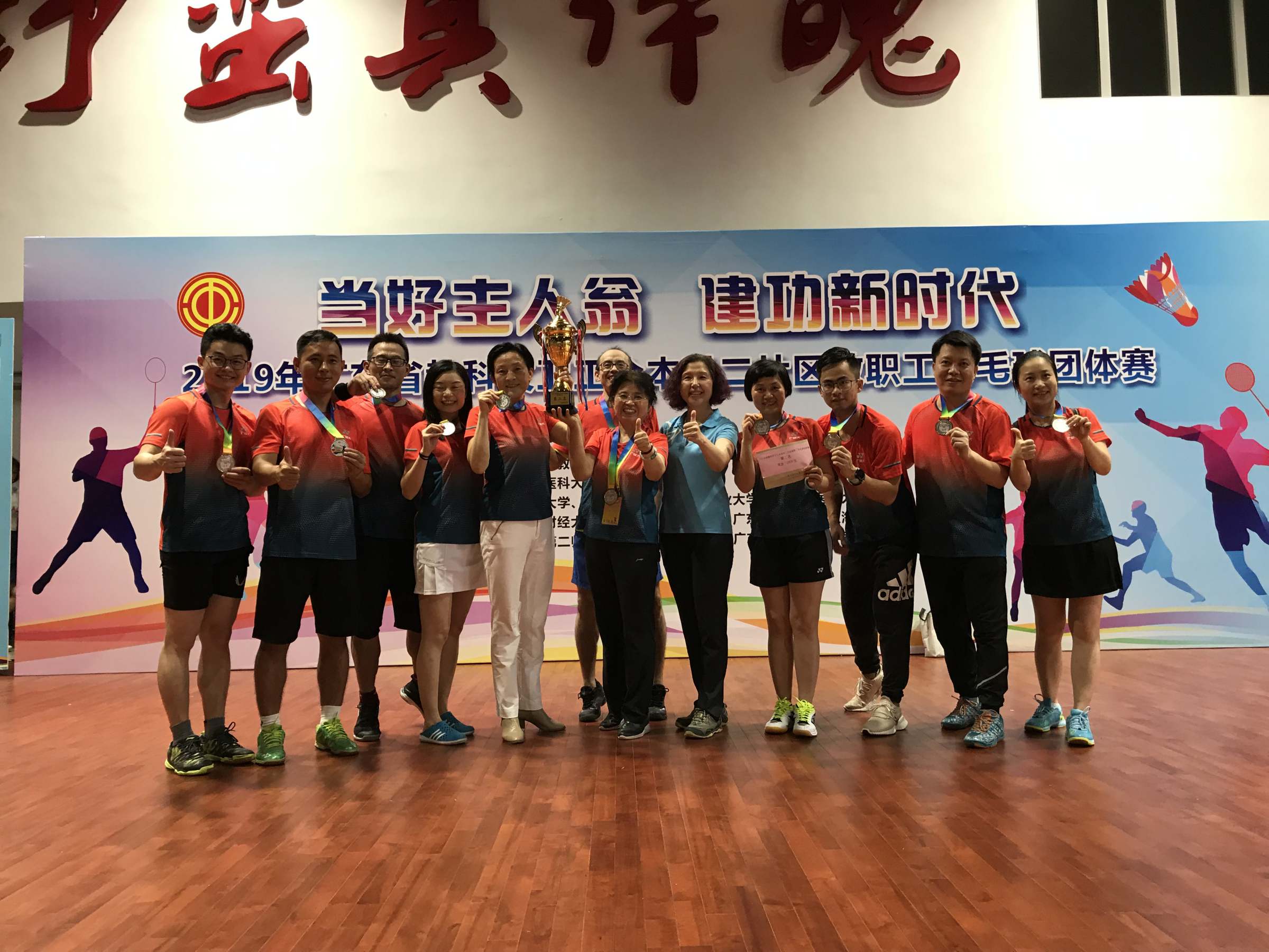 6月2日,2019年广东省教科文卫工会本科二片区教职工羽毛球团体赛在南方医科大学综合体育馆举行,参加本片区比赛的队伍有中山大学、南方医科大学、广东工业大学、广州中医药大学、广东财经大学、广东药科大学、星海音乐学院、广东第二师范学院、仲恺农业工程学院、广州工商学院、广东外语外贸大学南国商学院等11所本科院校代表队。省教科文卫工会主席谢岩梅出席开幕式并讲话。我校教工羽毛球队由校工会常务副主席苏时生带队参赛,经过一天紧张激烈的8场比赛,我校教工羽毛球队经历了技术、意志、体能及团队精神的考验,最终获本片区第二名,与广东药科大学、广东第二师范学院共同晋级广东省教科文卫工会系统教职工羽毛球团体赛总决赛。