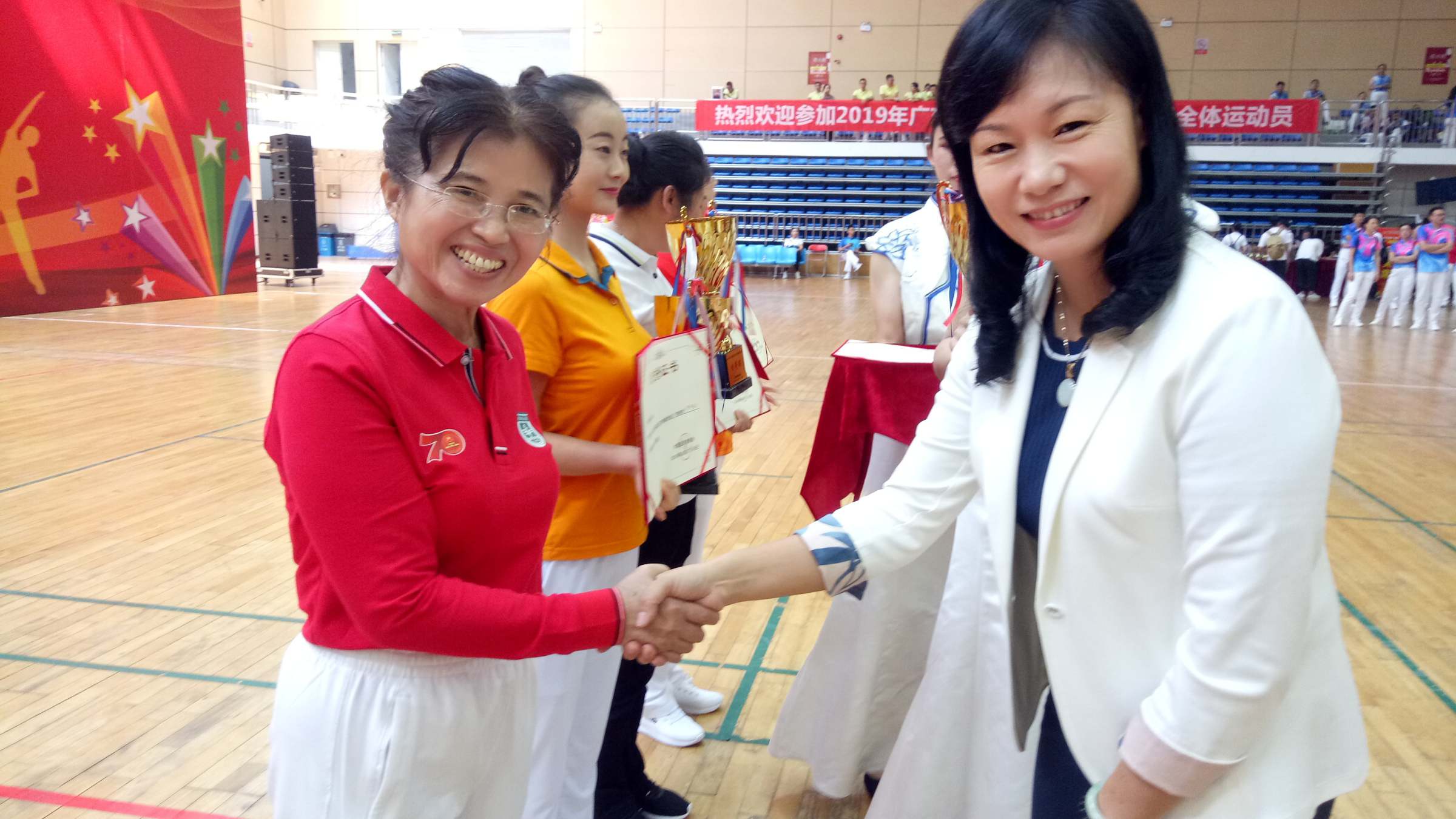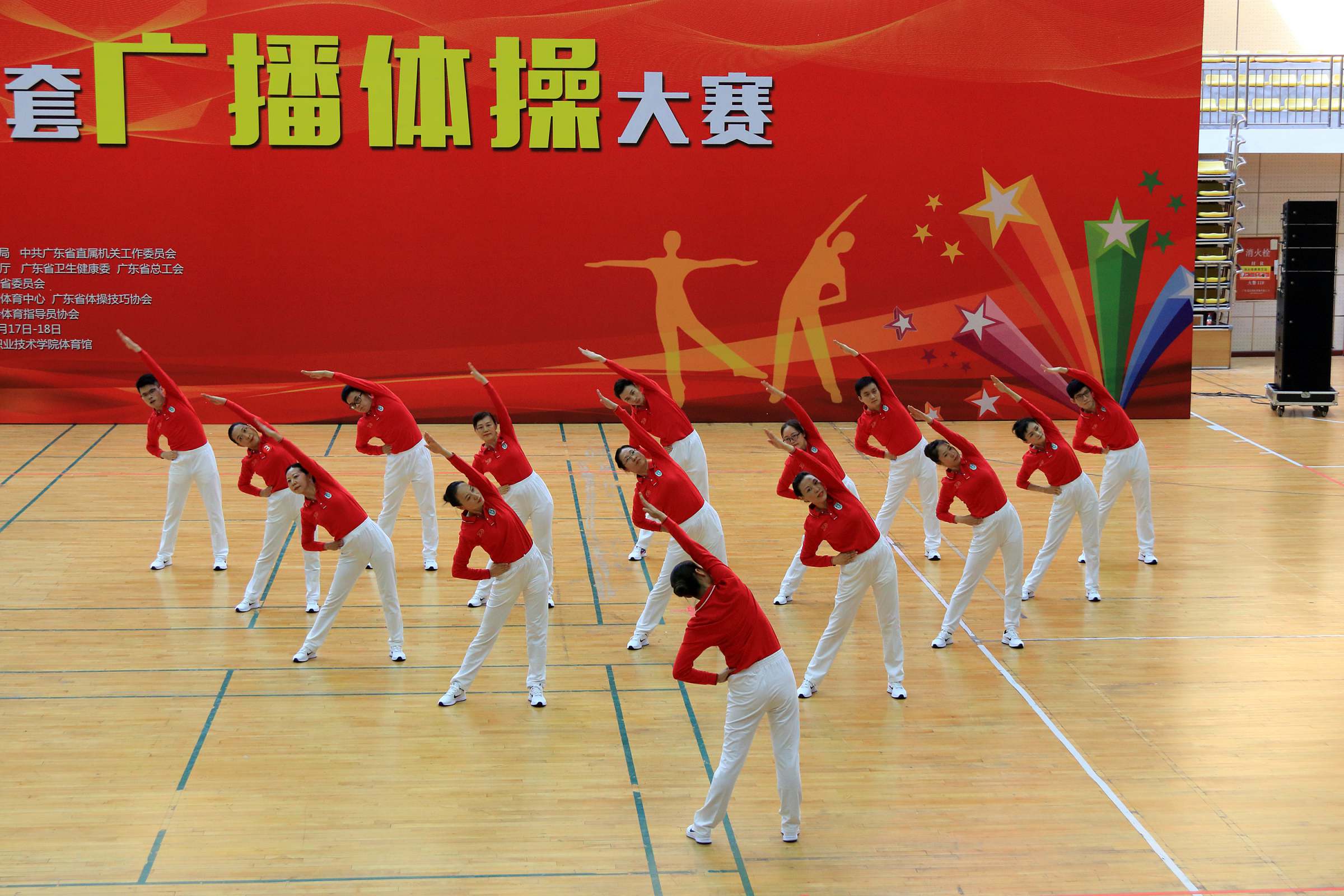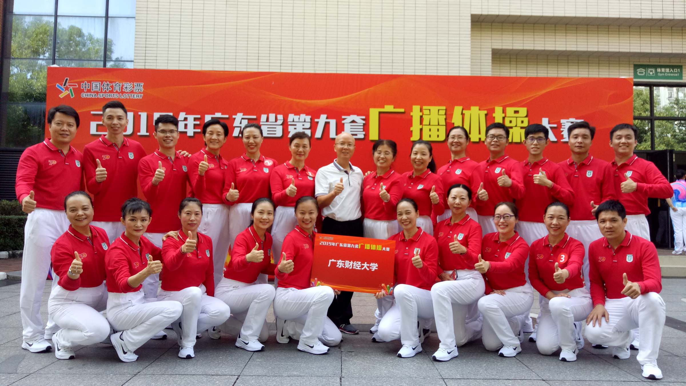 10月18日上午,广东省第九套广播体操大赛在广州体育职业学院举行。我校作为唯一的高等院校代表队参加比赛,并以总分第一名的成绩荣获“省直单位、省行业体协组”特等奖。校党委副书记、工会主席陈树武赛前为队员们加油鼓劲。校工会常务副主席苏时生带队参赛。