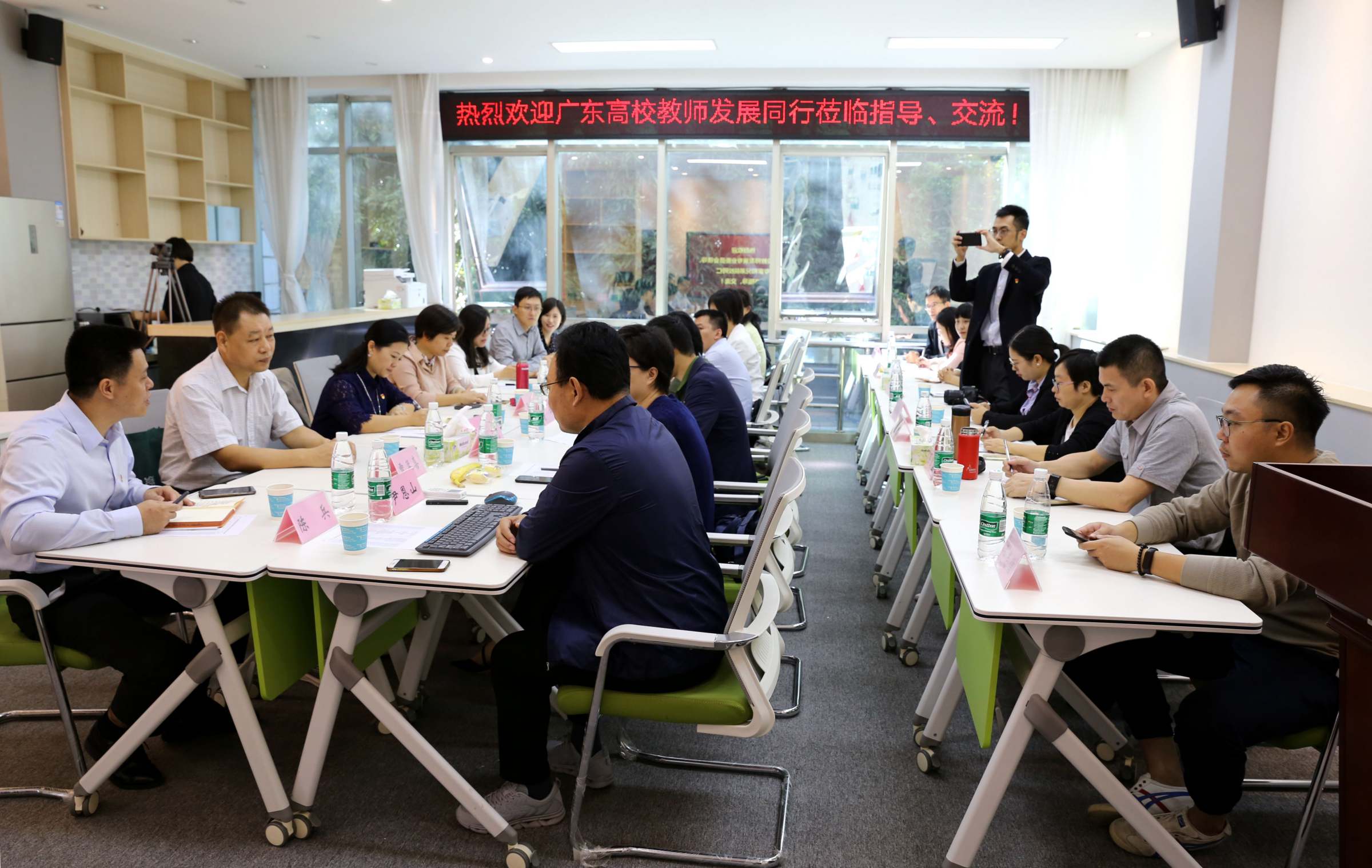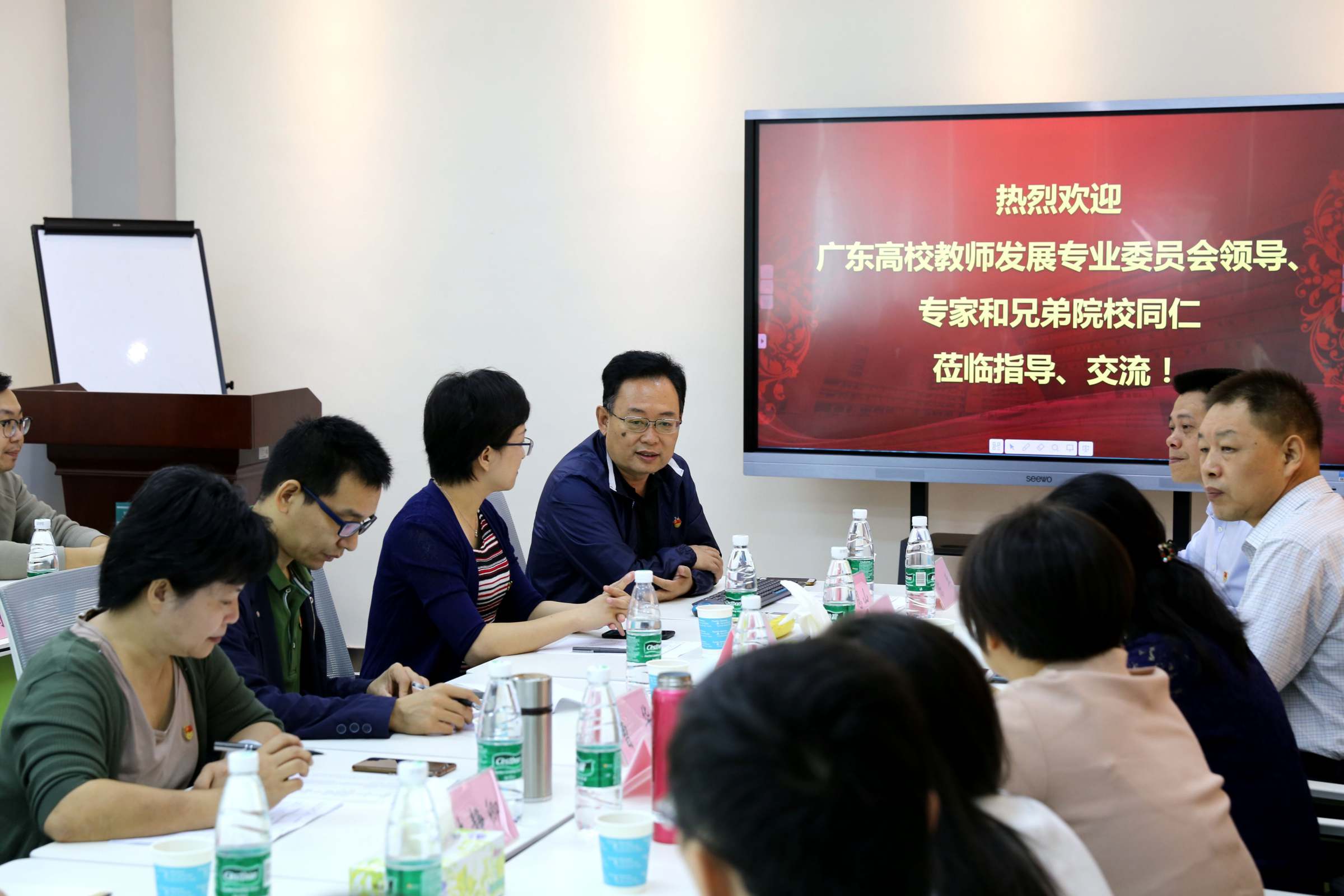 为深入贯彻落实习近平总书记在“不忘初心,牢记使命”主题教育工作会议上的讲话精神,更好的推动广东省高校教师发展工作,加强业界的学习交流,10月29日,广东省高等学校教学管理学会教师发展专业委员会组织高校教师发展机构代表来我校开展“不忘初心、牢记使命”主题教育工作暨业务交流活动。专委会秘书长、广东外语外贸大学教师发展中心陈兵带队,我校教师发展与教育技术中心主任尹恩山、副主任邓欣欣参加交流。本次活动得到了相关高校的积极响应,共有18所高校教师发展中心近30名代表参与活动。