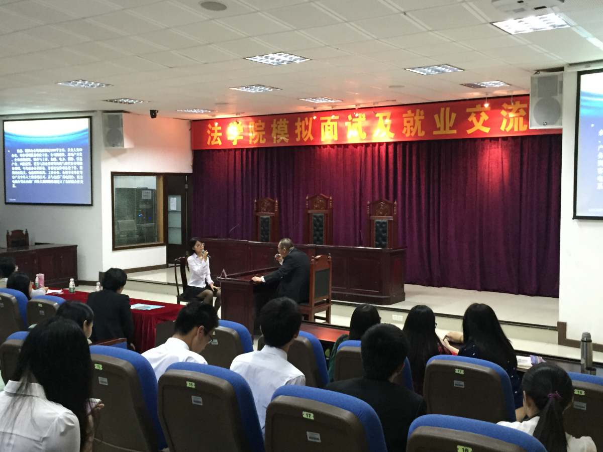 法学院模拟面试及就业交流会于4月21日晚在模拟法庭举行。广东颐和律师事务所律师陈玉博、东莞海昌实业有限公司经理曲琦、公务员校友代表杨琳担任模拟面试官。法学院副院长房文翠、党委副书记陈静等出席本次交流会。