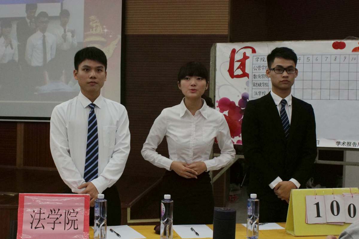 4月23日晚,由三水校区团工委举办的第十二届团建知识竞赛决赛在学术报告厅举行。来自公共管理学院、数学与统计学院、财税学院和法学院的四支代表队同台竞技,最终财税学院以总分335夺冠,法学院与公管学院分列亚、季军,数统学院获得优胜奖。