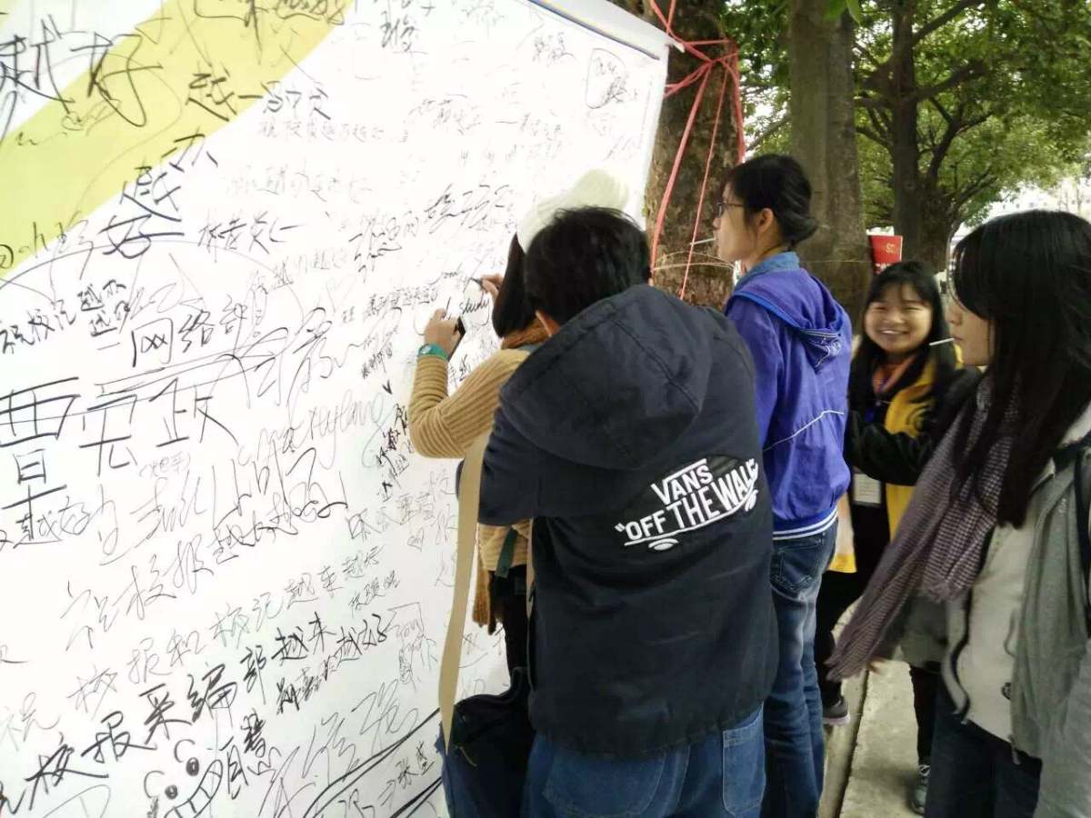 活动以闯关游戏的形式,把校报和记者团的发展史融入其中,并设立了签名留言纪念板,吸引了众多师生前来关注。尽管下起毛毛细雨,但是活动现场热闹不减,同学们都积极参与游戏并在写下对校报的祝福。