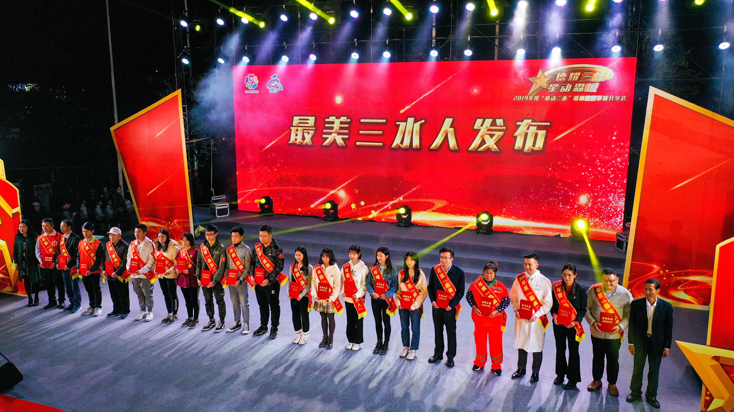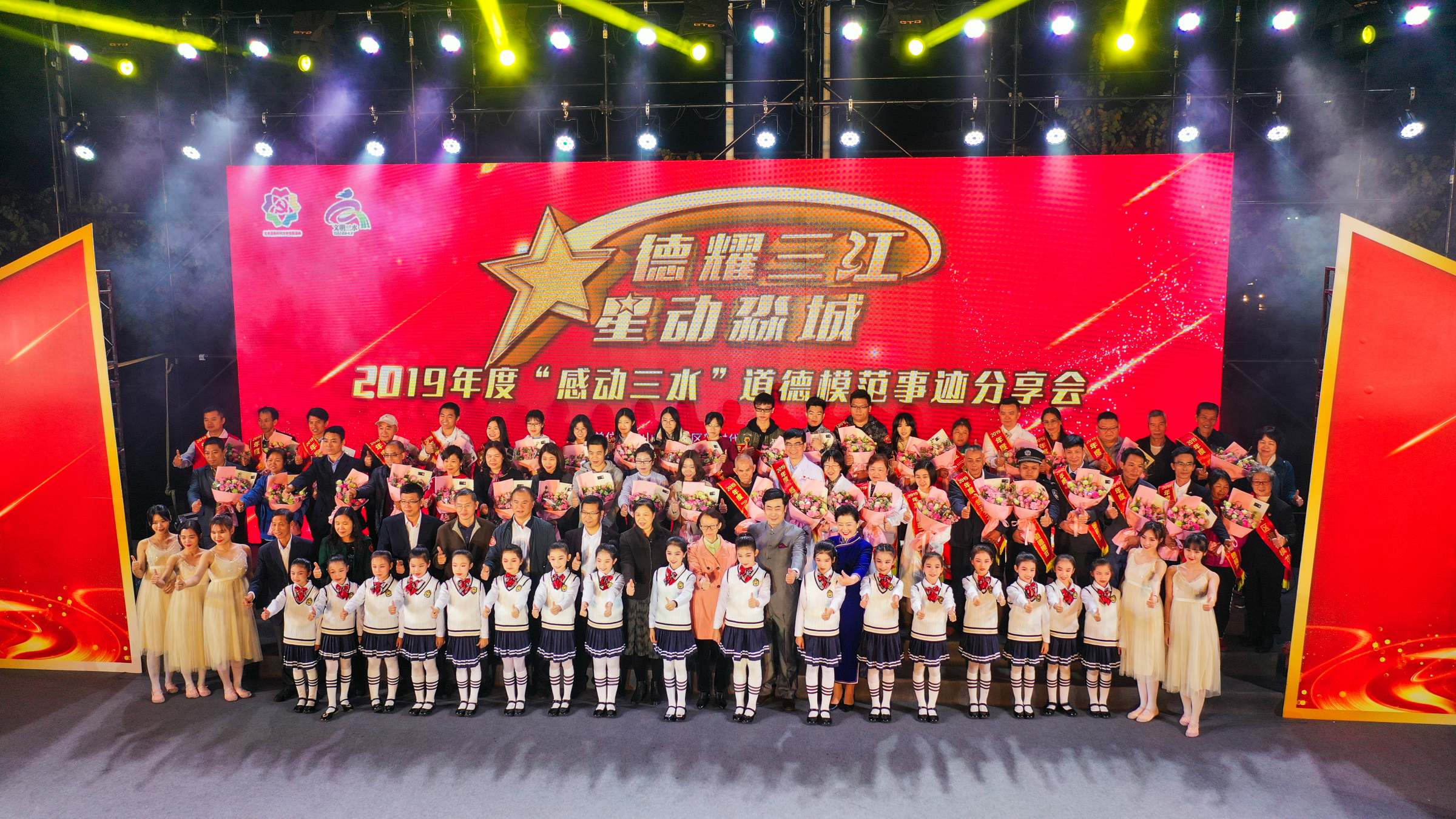 12月12日晚,“德耀三江 星动淼城”2019年度“感动三水”道德模范事迹分享会在三水举行,10组(12人)“感动三水”道德模范、10组(20人)“最美三水人”以及10家“友善企业”代表走上舞台,接受全城礼赞。区委、区人大、区政协相关领导,区文明委成员单位分管领导,各镇(街道)分管精神文明建设工作的领导,文明办负责人,历届道德模范代表,三水区老干部诗书画影研究会代表以及各界市民代表出席晚会。