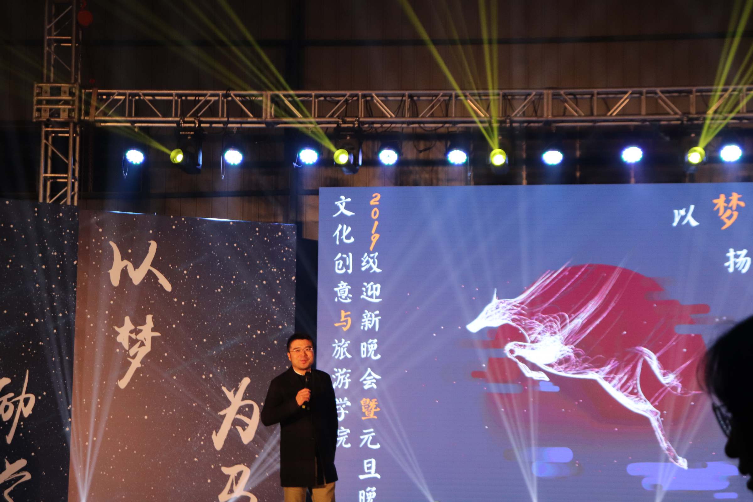 文化创意与旅游学院院长贾毅致辞,他对同学们加入文创这个大家庭表示欢迎与感谢,预祝全体师生新年快乐,并祝愿今晚的晚会圆满成功!