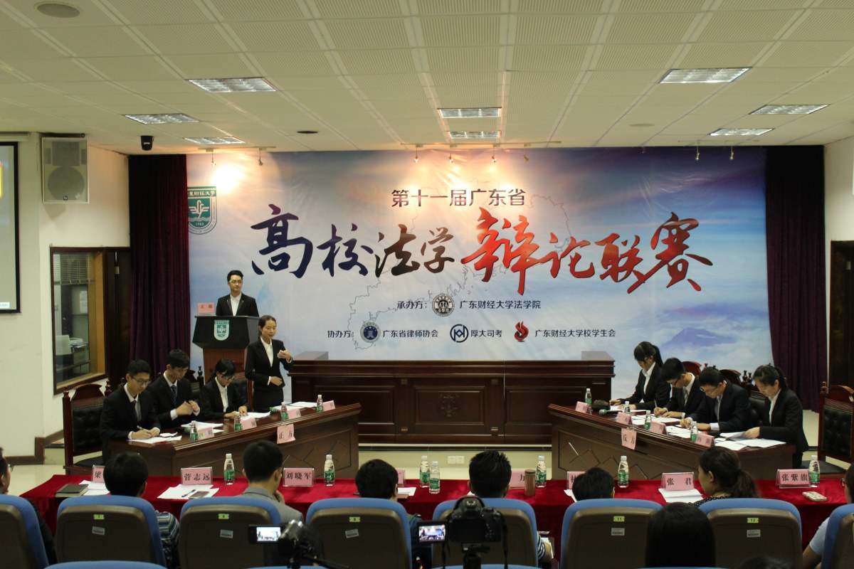 4月17日下午,由法学院承办,广东省律协、厚大司考、校学生会共同协办的第十一届广东省高校法学辩论联赛总决赛在我校广州校区模拟法庭举行。中大辩论队主教练肖力、林瀚,01年国际大专辩论赛亚军武汉大学辩手袁丁,03年国际大专辩论赛冠军队队员张君,以及盈隆律师事务所管委会副主任菅志远、广东广信君达律师事务所梁智刚、省律协青年律师委员会副主任刘晓军等律师担任评委。法学院党政领导邓世豹、王伟、陈静,校团委副书记张鹏程以及厚大华南教辅中心主任张紫旗等到场观看比赛。