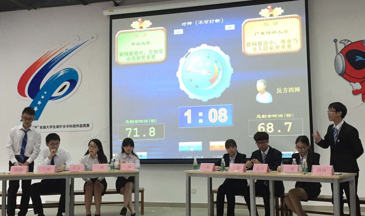 5月7日,首届广州大学城高校辩论联赛迎来收官战。我校辩论队(成员:杨舒敏、范毅俊、温卓恒、伍挺楷、吴慧仁、唐波宁、吴梓旸、马嘉豪、戴勋、王宇凡、黄金政、刘晓宇、易嘉愉、王俊人)与华南理工大学辩论队就辩题“应不应该允许同性恋者收养子女”展开辩论。经过激烈辩论,我校辩论队以6:2取胜,三辩唐波宁同学获得当场最佳辩手,从而全取本场比赛的4分(获胜3分,最佳辩手1分),最终以7场比赛积23分的成绩名列榜首。