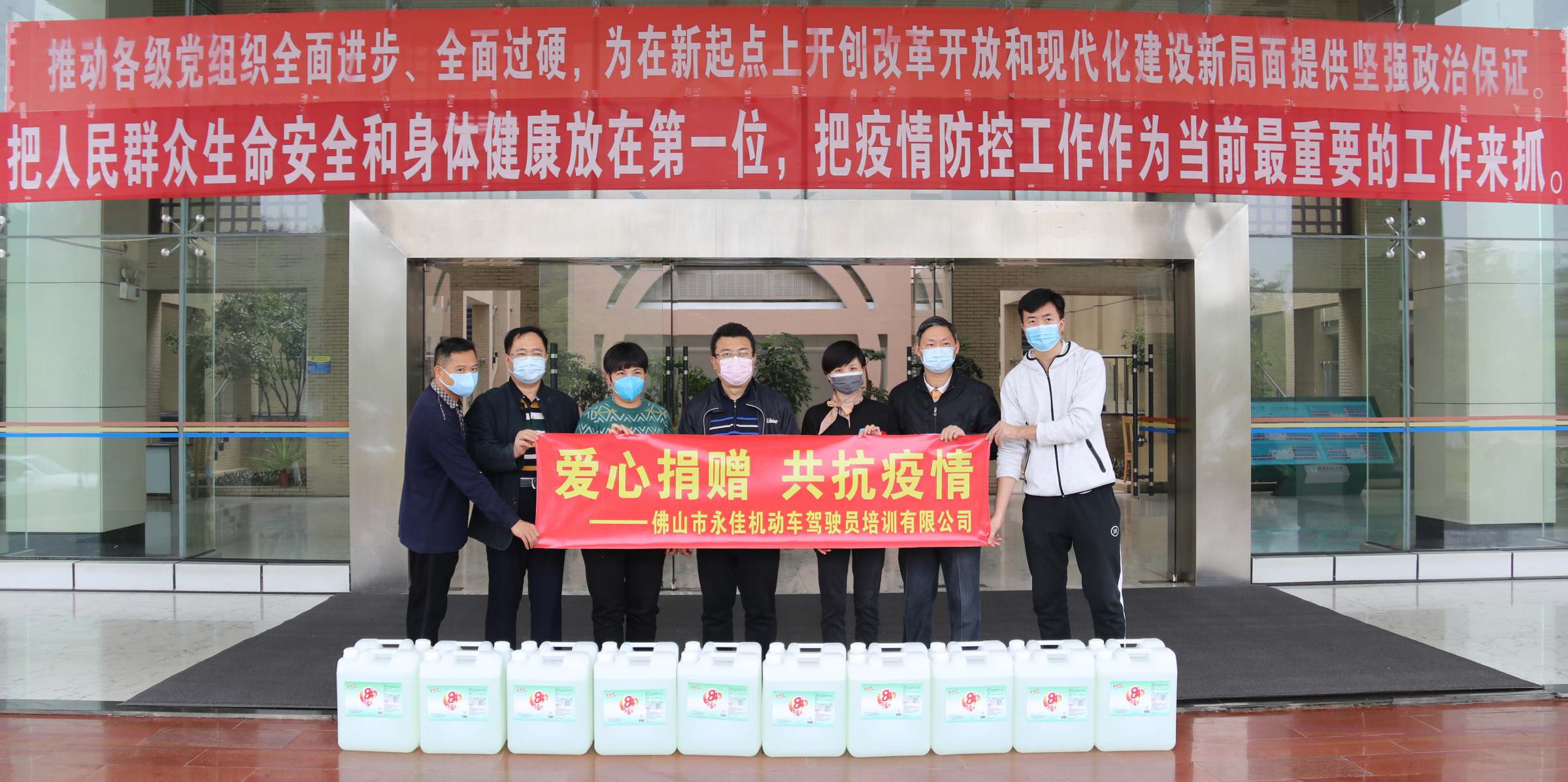同舟共济共克时艰,众志成城共战疫情。佛山市永佳机动车驾驶员培训有限公司心系我校抗疫工作,3月7日下午,公司总经理谢秋凤一行到访佛山三水校区,向校区捐赠20桶(每桶40升)84消毒液。