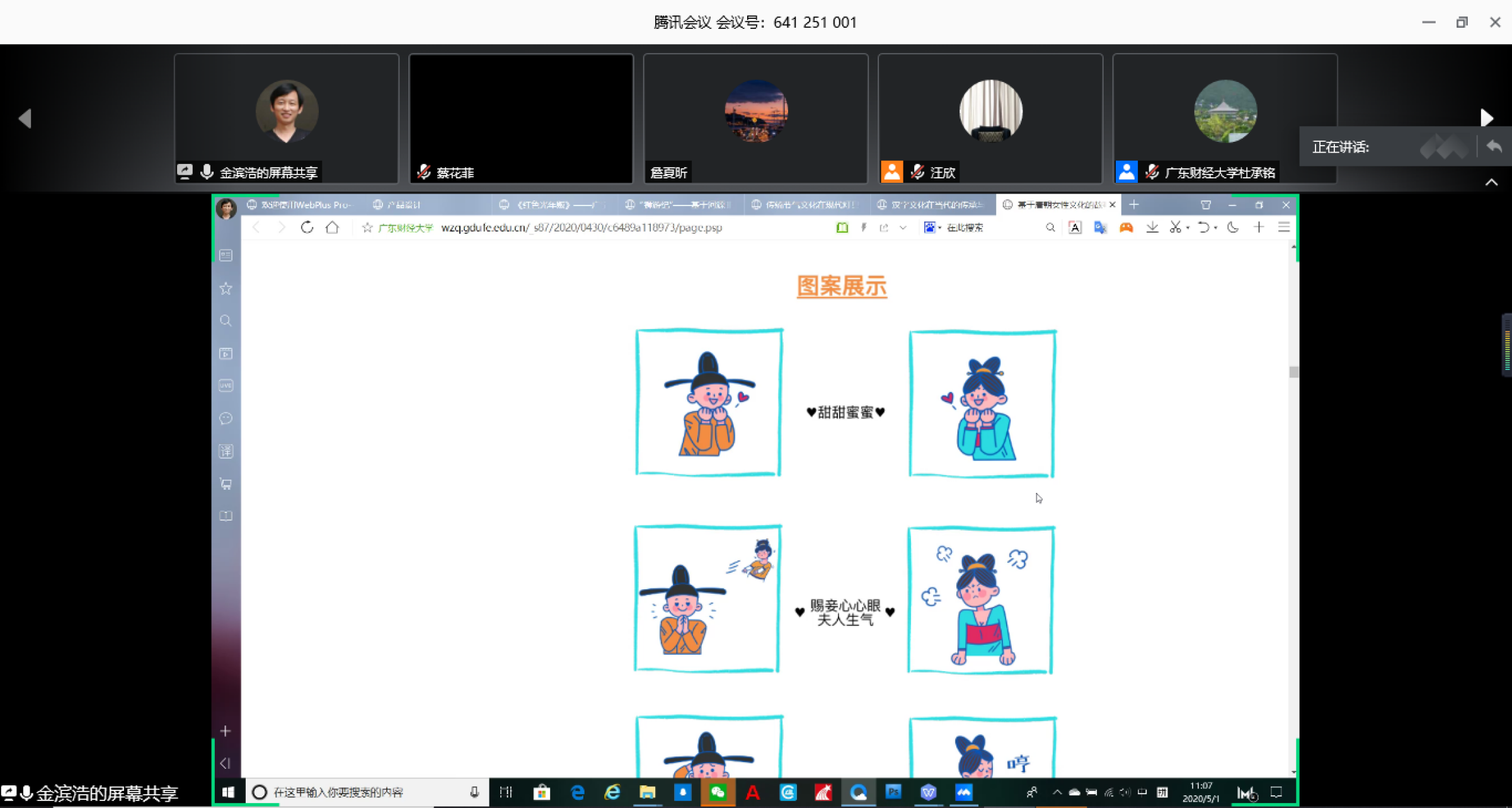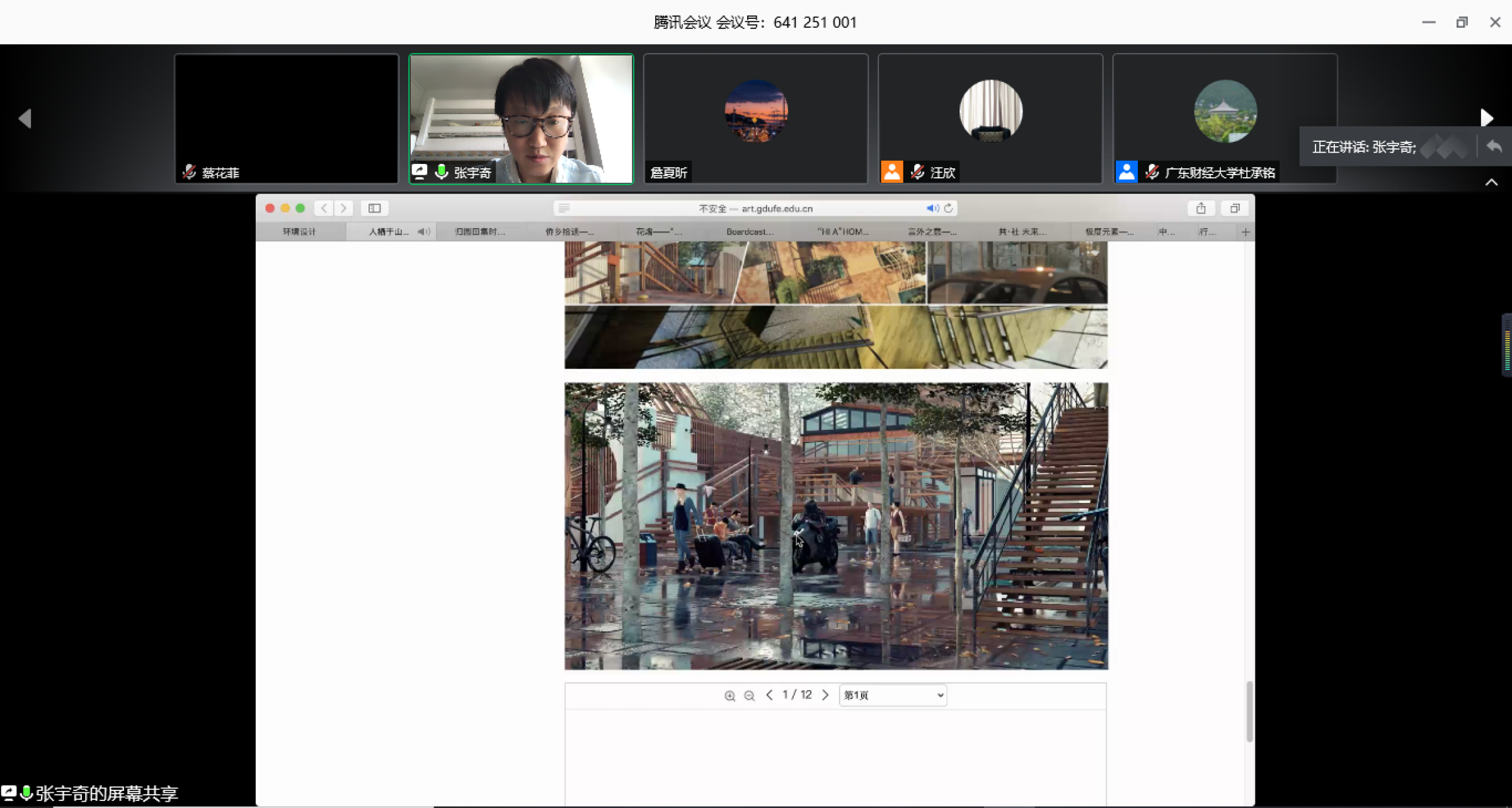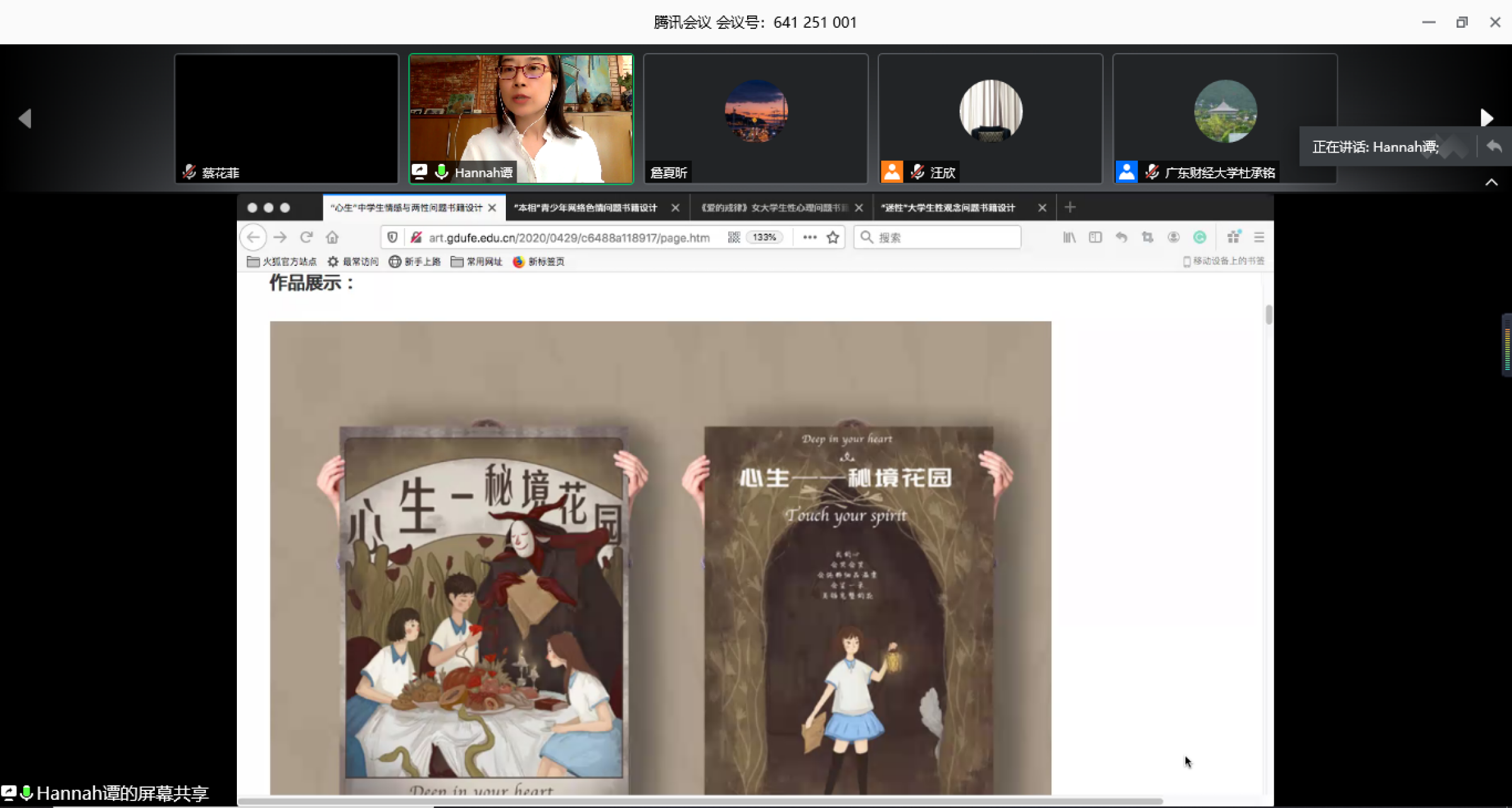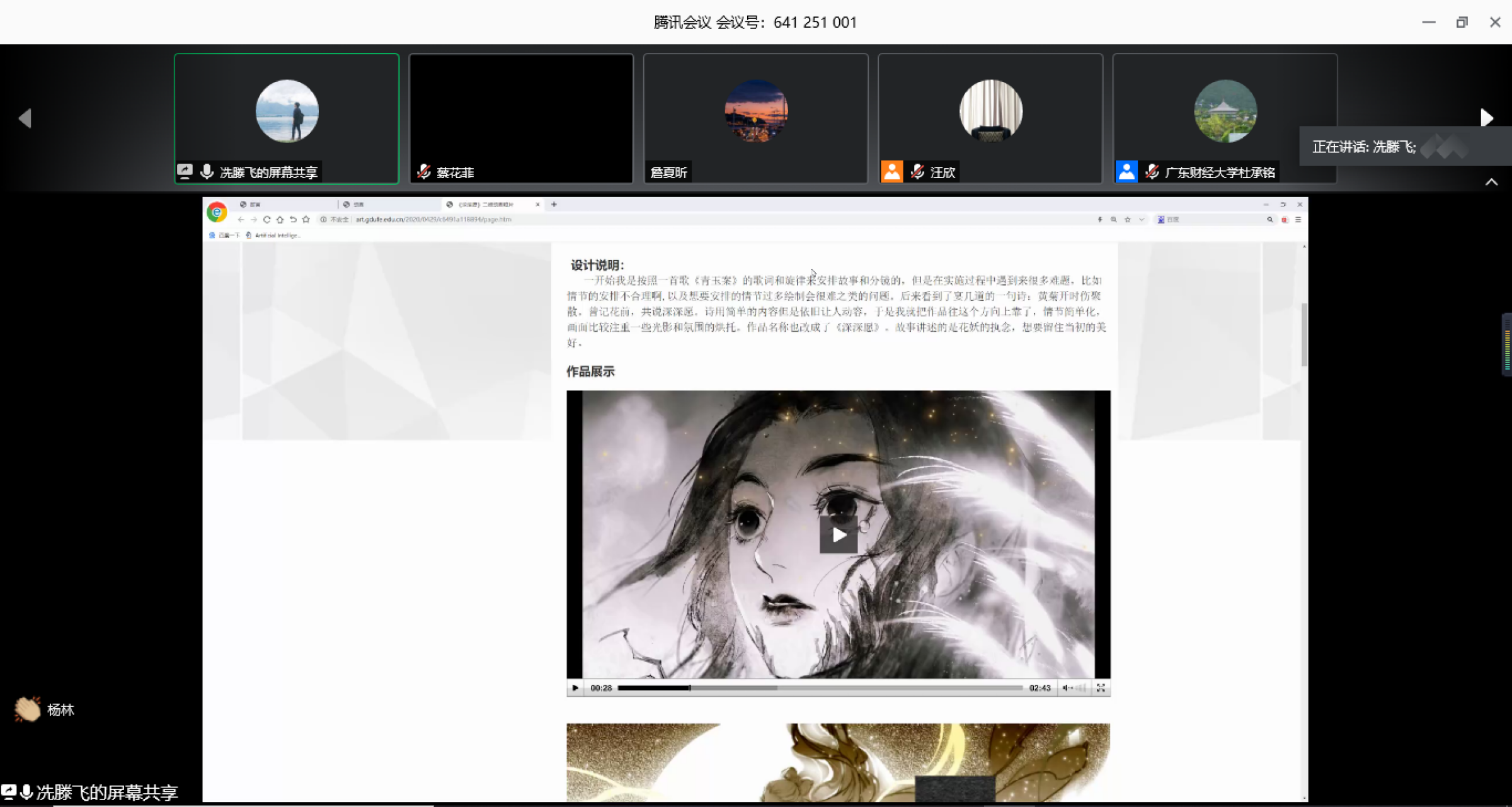 四个专业的指导老师代表分别介绍了毕业作品的情况。环境设计专业张宇奇老师介绍了环境设计毕业作品总体情况及现实意义,体现了前沿性、文化性和实践性,具备一定的学术高度和研究价值;视觉传达设计专业谭旭红老师介绍了视觉传达系作品中的优秀之处,更多地关注到了现实问题,具备良好的实践价值,有利于引导青少年树立正确的情感与性意识;动画专业冼腾飞老师展示部分动画作品的独特特点,展现了在充满商业探索前沿与生活色彩的风格、不断传递价值与审美观;产品设计专业金滨浩老师提到了产品专业的同学今年更加侧重于文化文创产品的设计,通过对不同地域文化、语言文化、历史文化的不断探索与开发创作了大量有趣也有意义的作品。