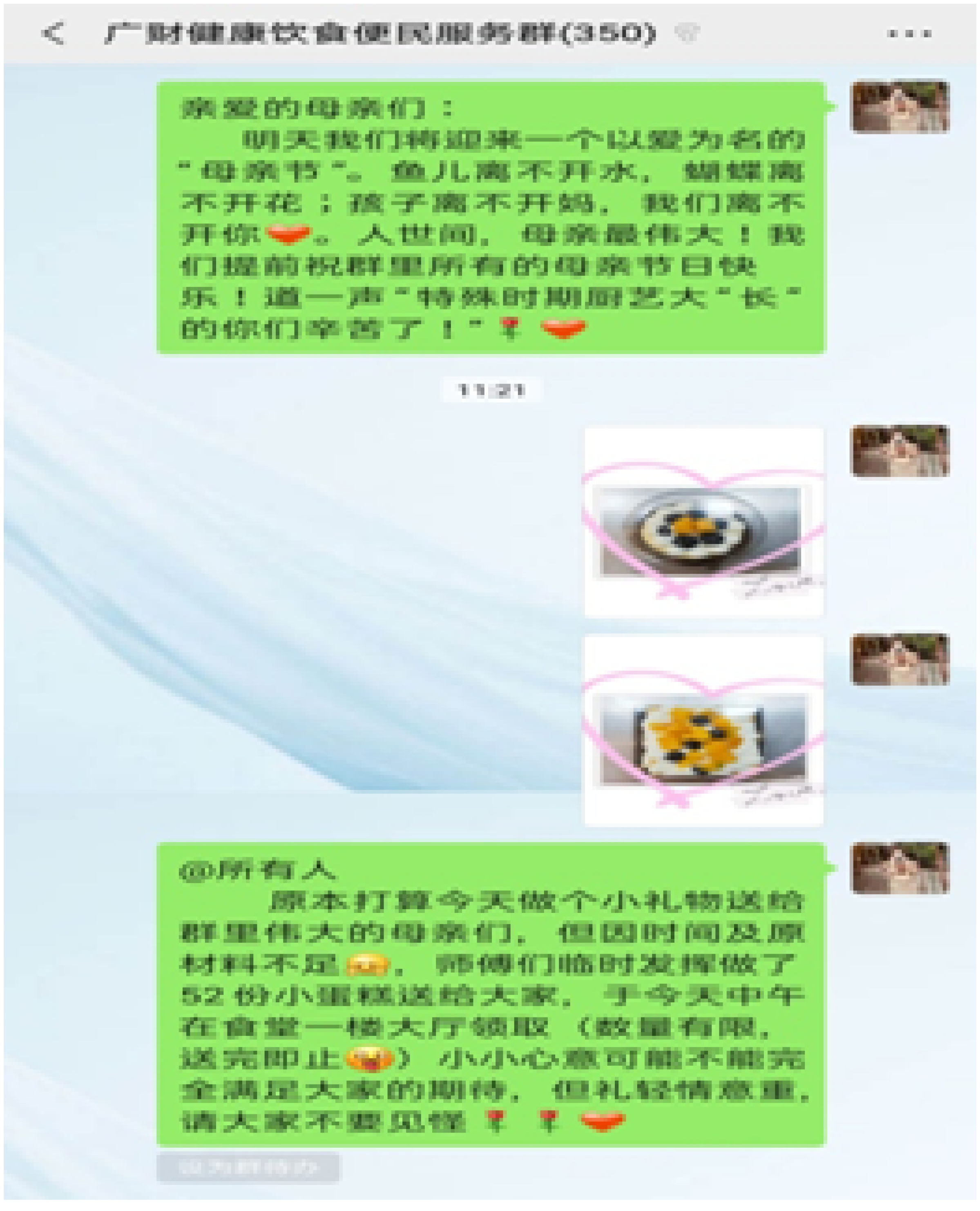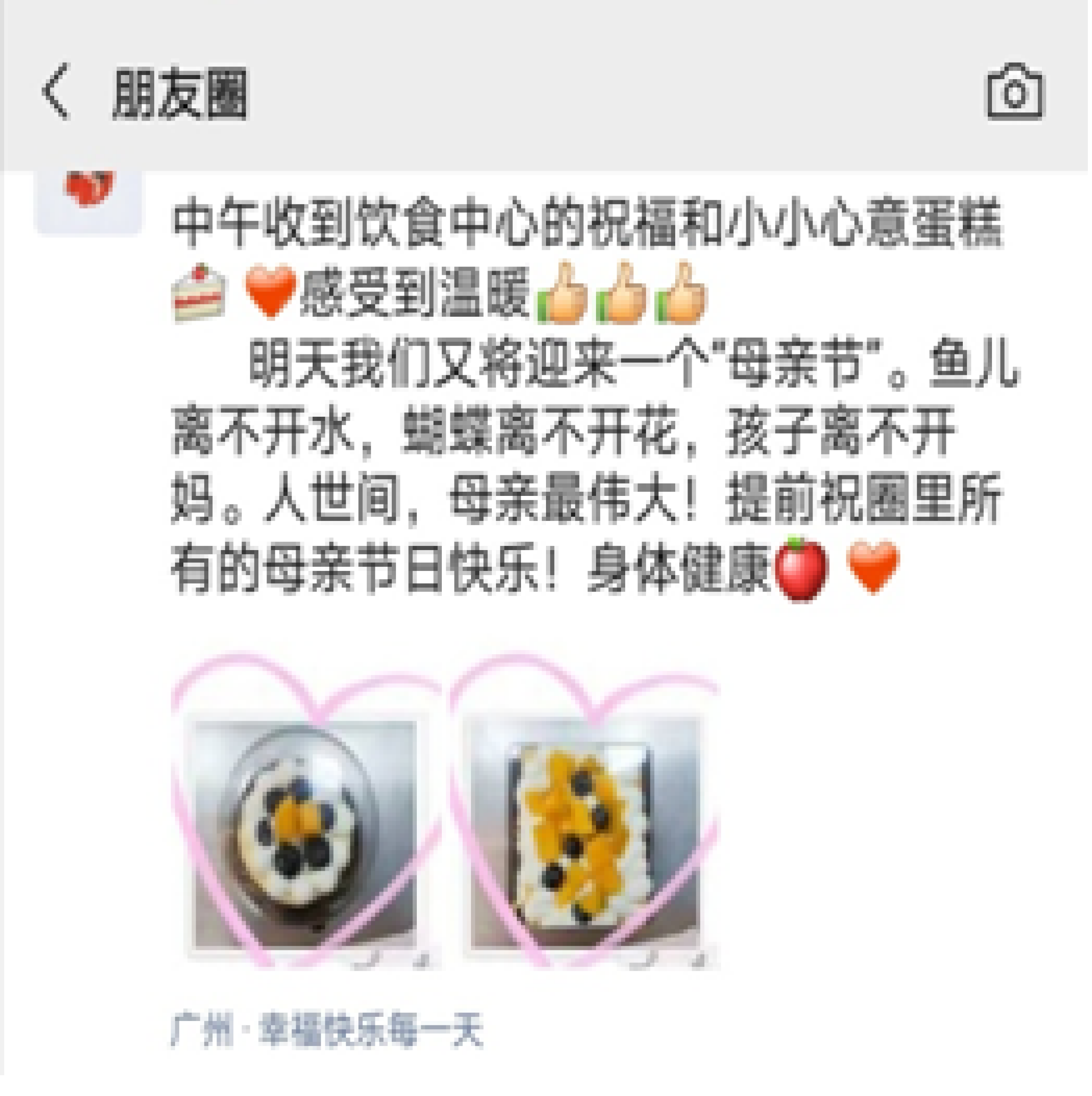 伴随着康乃馨丝丝缕缕的幽香,5月10日迎来了以爱为名的“母亲节”。为了让在校的母亲们度过一个温暖的节日,5月9日中午,广州校区学二食堂准备了“母亲节小蛋糕”,送给在这特殊时期里坚守岗位的母亲们,并送上母亲节祝福。蛋糕虽小,真情无限。小小蛋糕与温馨祝福代表了学二食堂对广大老师们的感谢与支持,此举得到了广大老师们的好评,纷纷点赞并直称“太贴心了”。