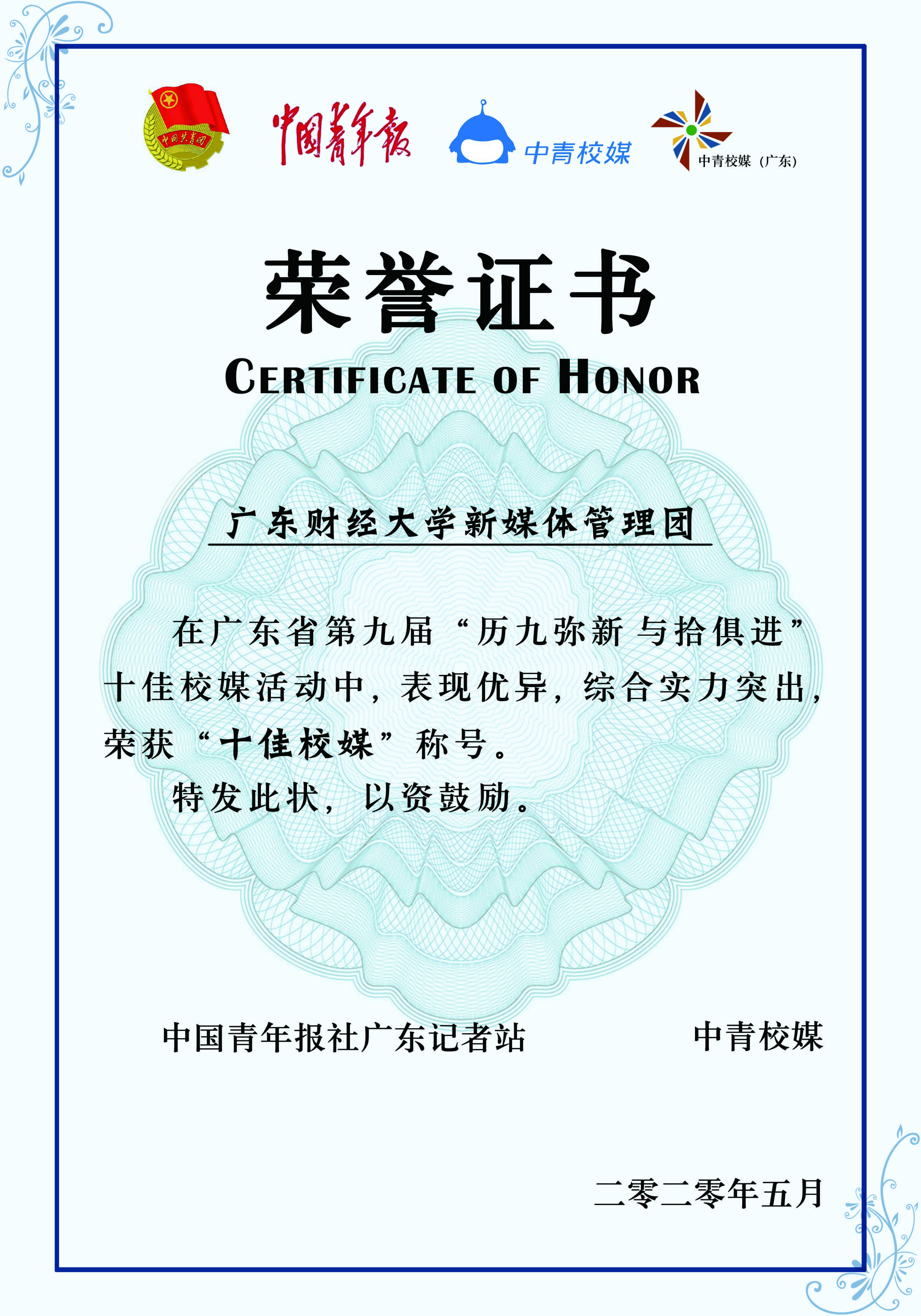 5月17日,校新媒体管理团在中青校媒主办的“历九弥新,与拾俱进”第九届广东省十佳校媒评选活动中荣获“十佳校媒”荣誉,运营官微官博四年多,校新媒体管理团首次获此殊荣。来自学校的另一支媒体团队《人文院报》亦表现突出,荣获最具风尚奖。