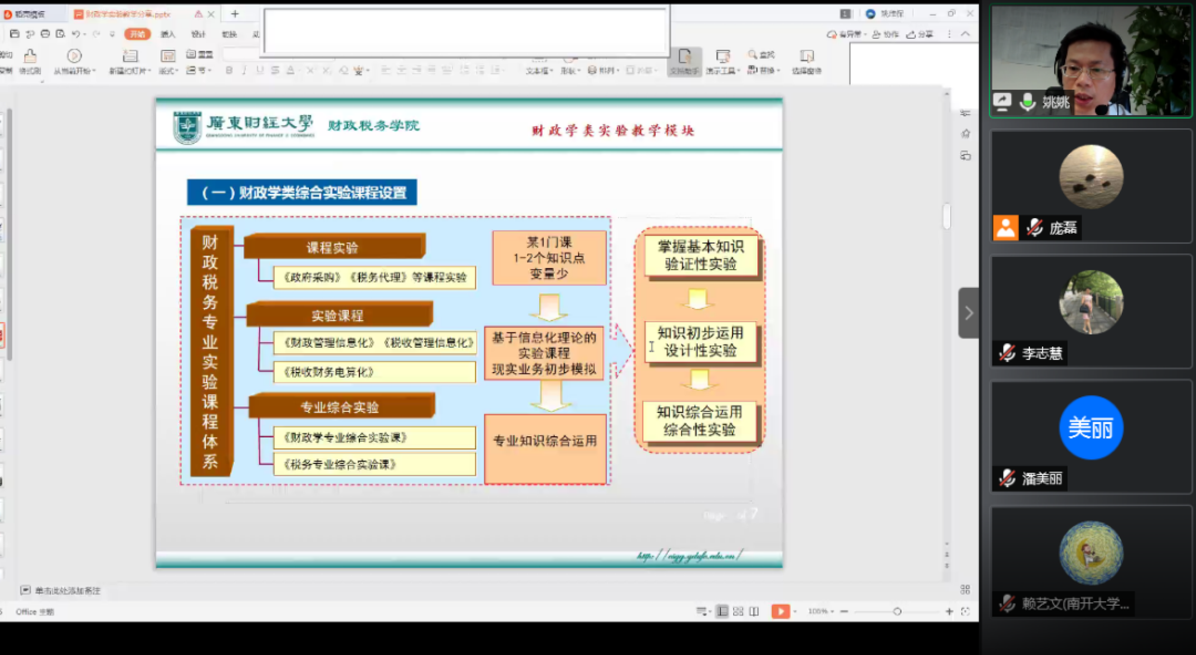 我校经济与管理实验教学中心主任车嘉丽教授以及财政税务学院实验教学团队骨干成员姚维保、方丽君、郭嘉仪、黄冬如老师进行了教学分享。分享的内容主要有:经管类专业实验教学改革与探索、财政学类专业实验教学模式与体系、财政学专业综合实验课、税收学专业综合实验课、税收管理信息化课程、政府采购电子化课程等。