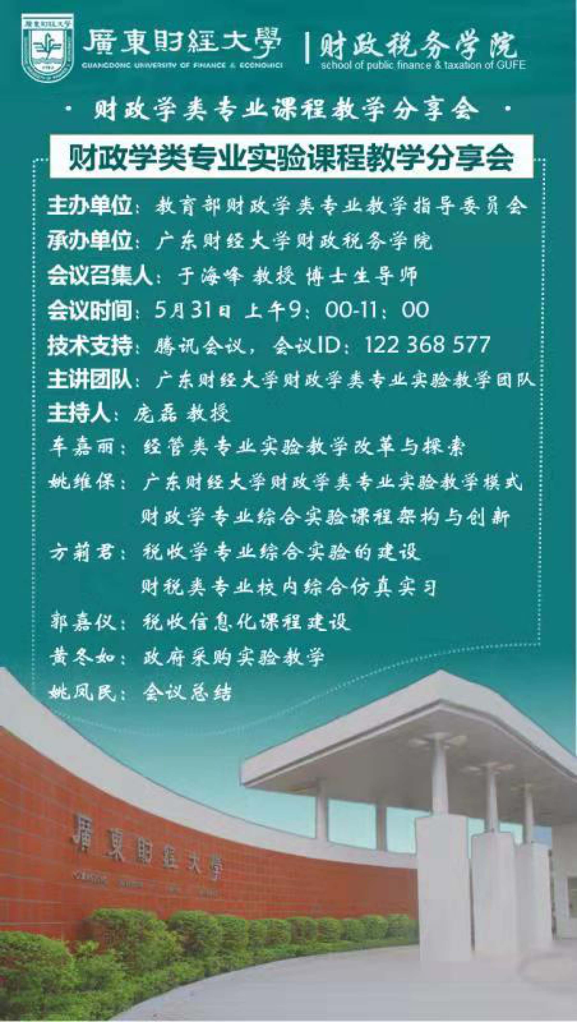5月31日,由教育部财政学类专业教学指导委员会主办,我校财政税务学院承办的第十一期财政学类专业课程教学经验分享会以线上直播的方式召开。本期分享会的主题是“财政学类专业实验教学建设”。来自国内数十所高校的150余位专业教师参加了会议。教育部财政学教指委委员、校长于海峰教授和教指委秘书长、山东大学经济学院副院长石绍宾出席会议并分别致辞。财政税务学院院长庞磊教授主持会议。