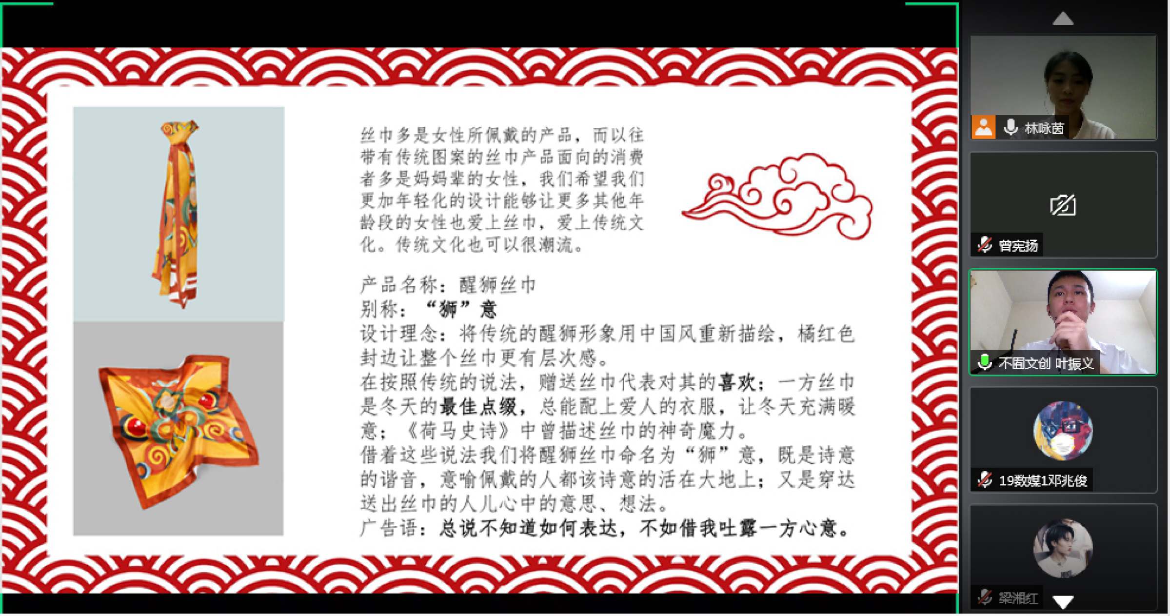 为弘扬文化创新精神、激发文化创意活力,6月16日晚,文化创意与旅游学院“以文创艺”文创产品营销策划大赛决赛于腾讯会议顺利举行。学院党总支副书记兼副院长王青、团委书记刘鸿华、辅导员刘凤娇出席了本次活动,学院专业教师曾宪扬、邹洁、吕宣担任本次比赛评委。