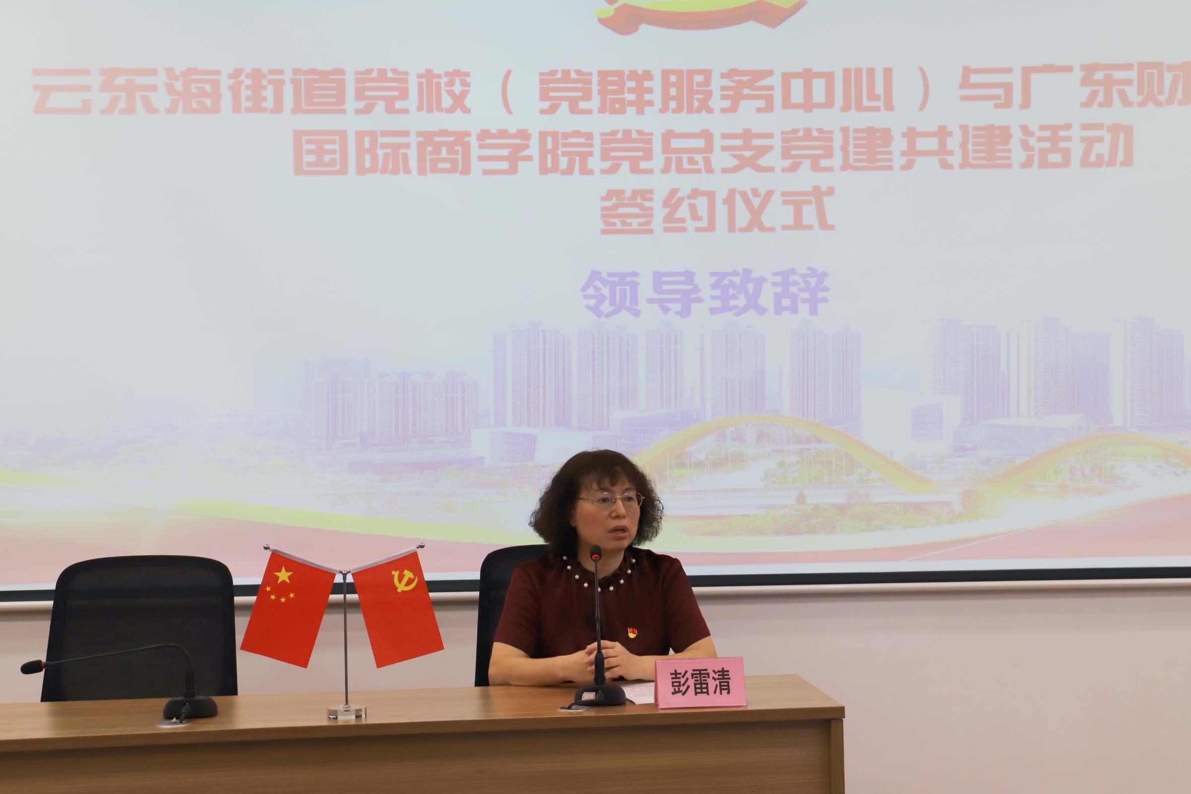 邱龙海致辞。他表示,云东海街道党校与广东财经大学国际商学院党总支组建“党校高校”联盟,以“党建+产学研+育人”的方式,立足区域经济产业,开展产学研合作和人才培养,对街道、学院及企业发展均具有十分重要的意义。