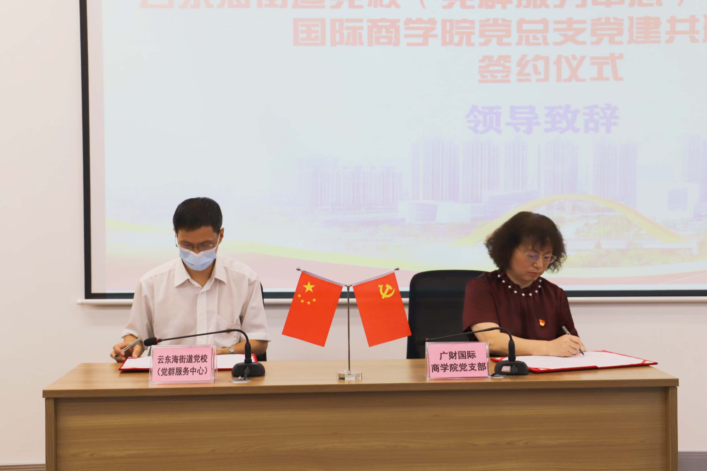 为积极推进政校合作项目的有效实施和运作,6月30日下午,国际商学院党总支与佛山市三水区云东海街道党校(党群服务中心)党建共建活动暨签约聘任仪式在云东海街道党校举行。国际商学院党总支书记兼执行院长彭雷清、副院长王宇晖、党总支教工党支部书记兼院长助理彭中文,三水区委组织部常务副部长杨胜坤、云东海街道党工委副书记、党校常务副校长邱龙海,国际商学院党员代表,云东海街道机关党支部支委,各村(社区)党委(总支)副书记以及红领联盟的党员代表参加签约仪式。