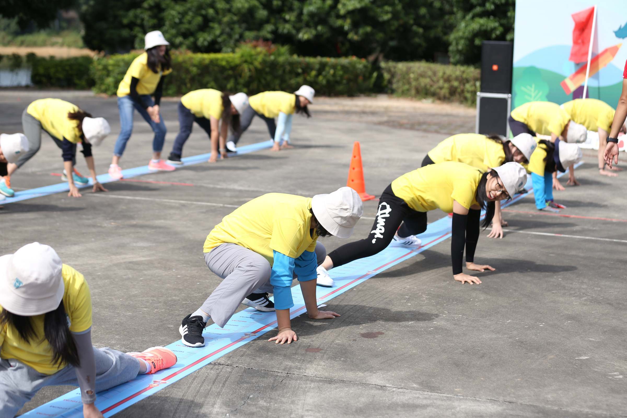 在素质拓展活动中,活动教练首先让老师们组队、选出队长、设计队旗、队名和口号。第一个素质拓展活动项目是“手足同心”,8支队伍的队员们脚与脚相连,尽力使自己脚与队友脚相连时劈叉最长,从而赢得自己团队长度成绩;第二个是“同舟共济”,队员们需在二块颤抖不停的塑料垫上交替前进,没有团结互助、同舟共济的毅志力,根本就不可实现;第三个是“书写未来”,每组队员抱着一支看不到笔芯的大笔,在画板前工整地写下“厚德、励学、笃行、拓新”;第四个是“共创辉煌”,一个人、少数人不能拉起的大鼓,依靠全体队员共同用力就能拉起来,团结一心还能用大鼓一起颠球,挑战不可能;第五个是“旱地冰壶”,团队要达成共识,借众人之智慧,发挥集体主义精神方能取胜。