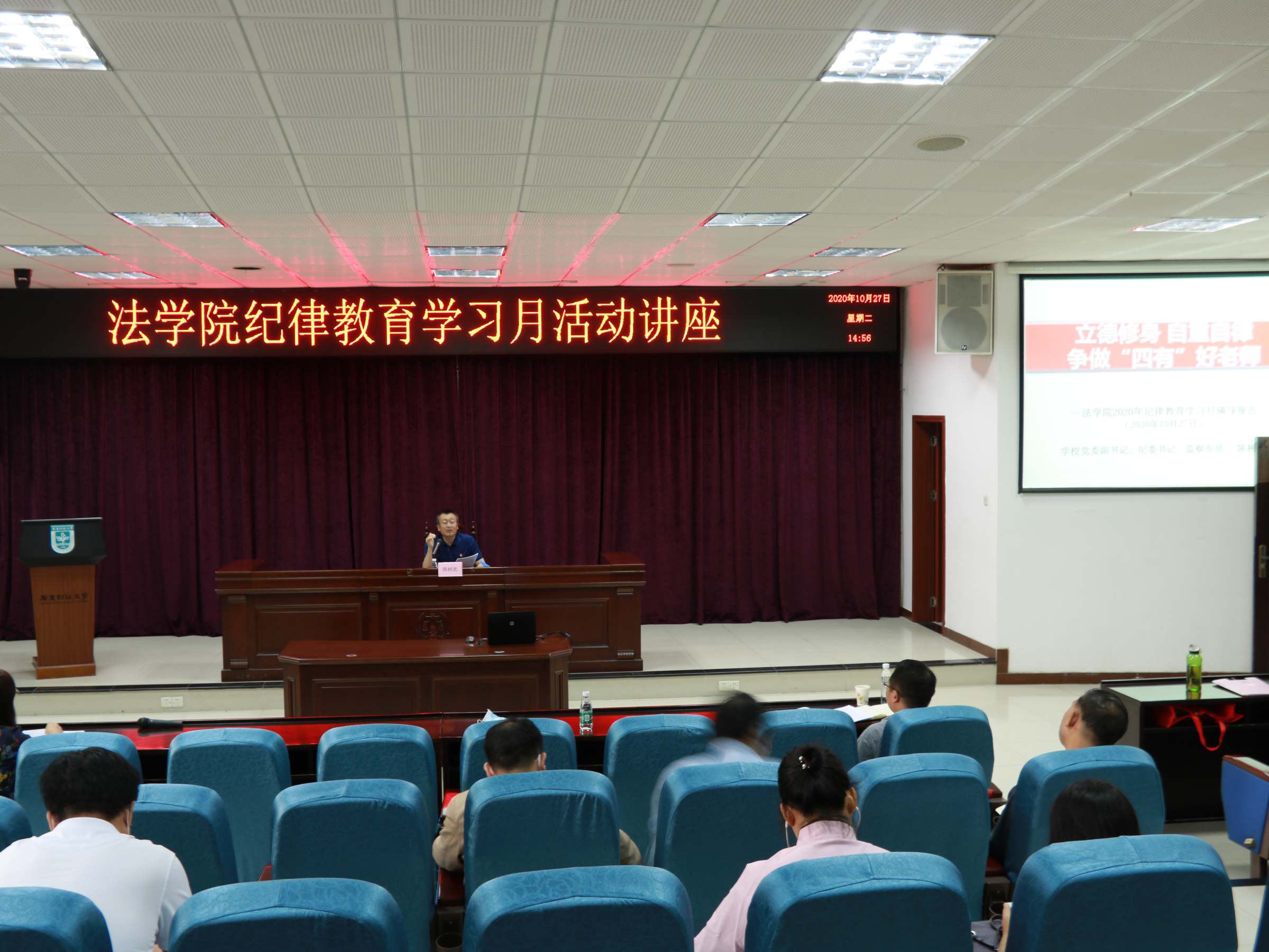 10月27日下午,校党委副书记、纪委书记陈树武到法学院作纪律教育学习月专题辅导报告。报告会由法学院副院长孟国碧主持,法学院全体教职工参加。