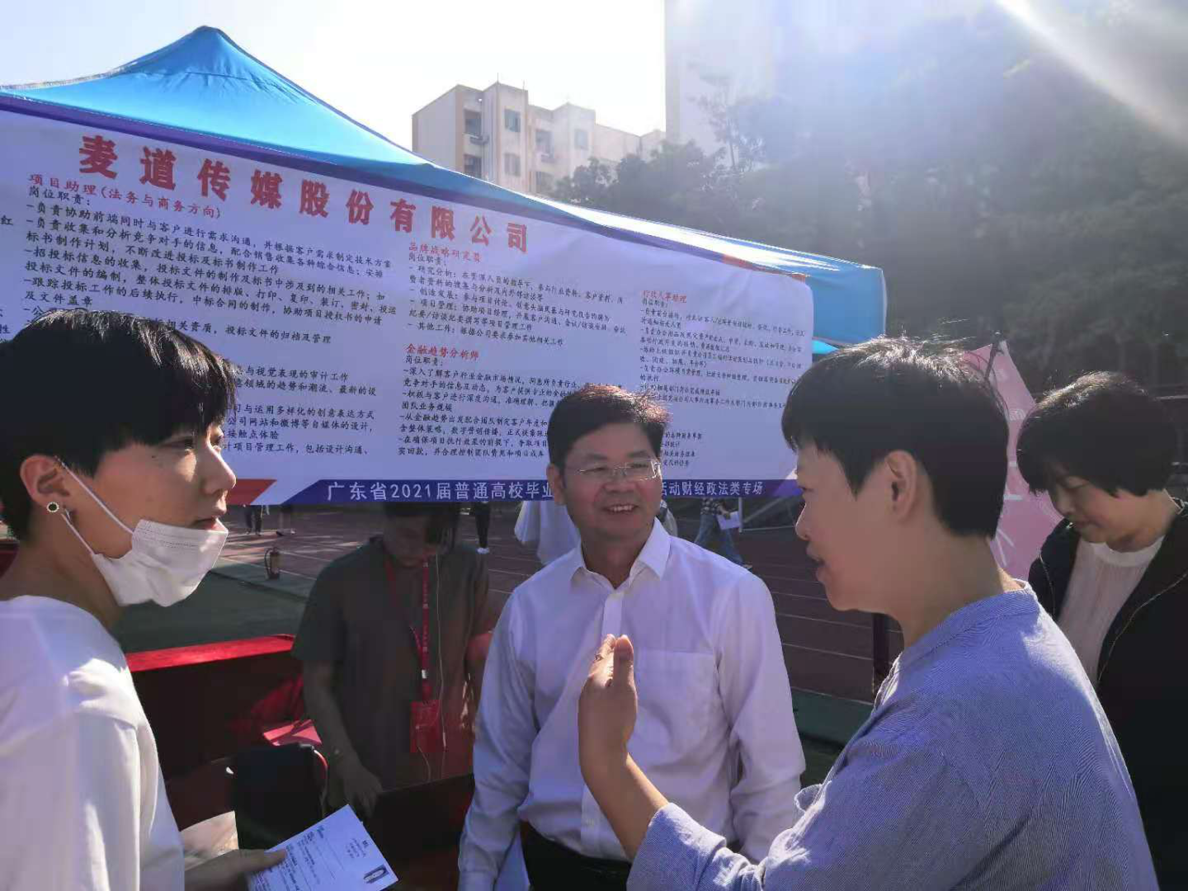 11月10日,由广东省教育厅主办、我校承办的“广东省2021届高校毕业生就业供需见面活动(财经政法类专场)”在广州校区田径场举办。校党委副书记罗贤甲、学生就业指导中心主任胡卫标到场了解企业招聘需求和学生的求职情况。