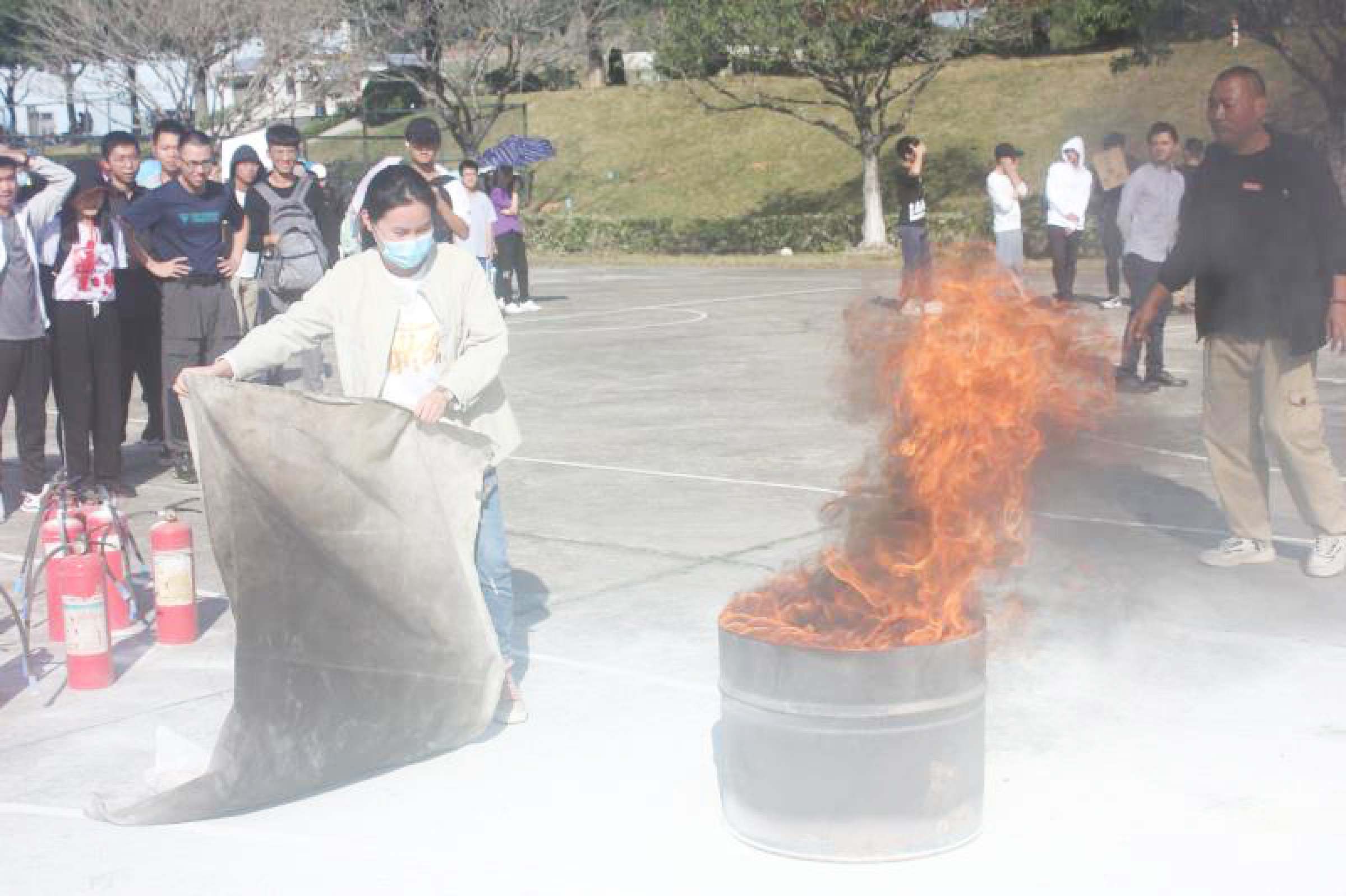 王文忠为现场人员系统讲解了抛水带、油桶灭火和灭火器灭火的动作要领并示范。来自校区各部门的学员们积极学习消防技能,按规范动作要求进行模拟演练。