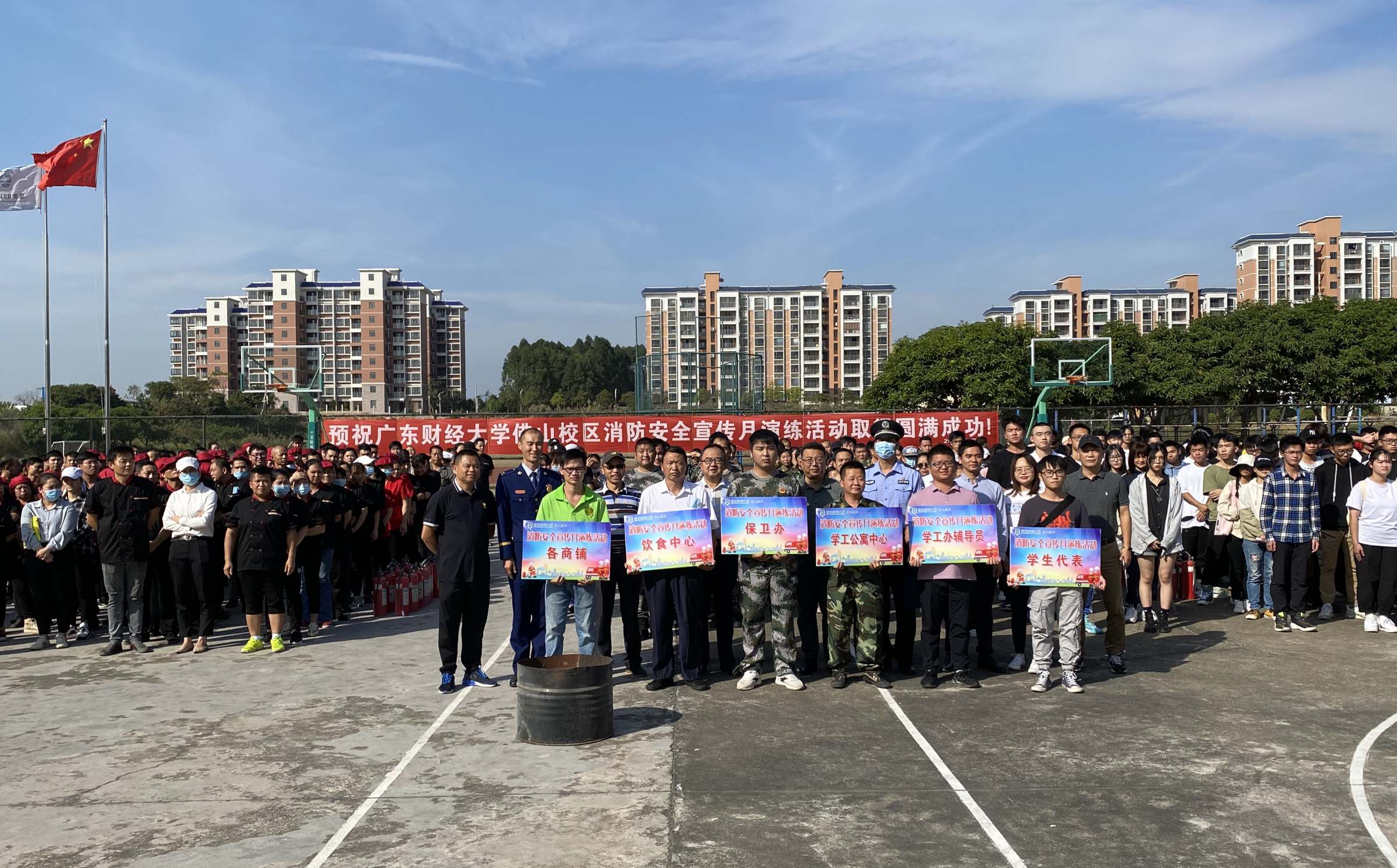 11月10日下午,佛山校区在校区篮球场举行消防安全宣传月演练活动,保卫办、学工办、饮食中心、研究生分院及各商铺等相关人员参加。校区党委常务副书记、管委会常务副主任冯东海,管委会副主任陈镇恭出席活动,活动由校区保卫办主任方彤彤主持。陈镇恭作活动动员讲话,冯东海宣布活动开始。