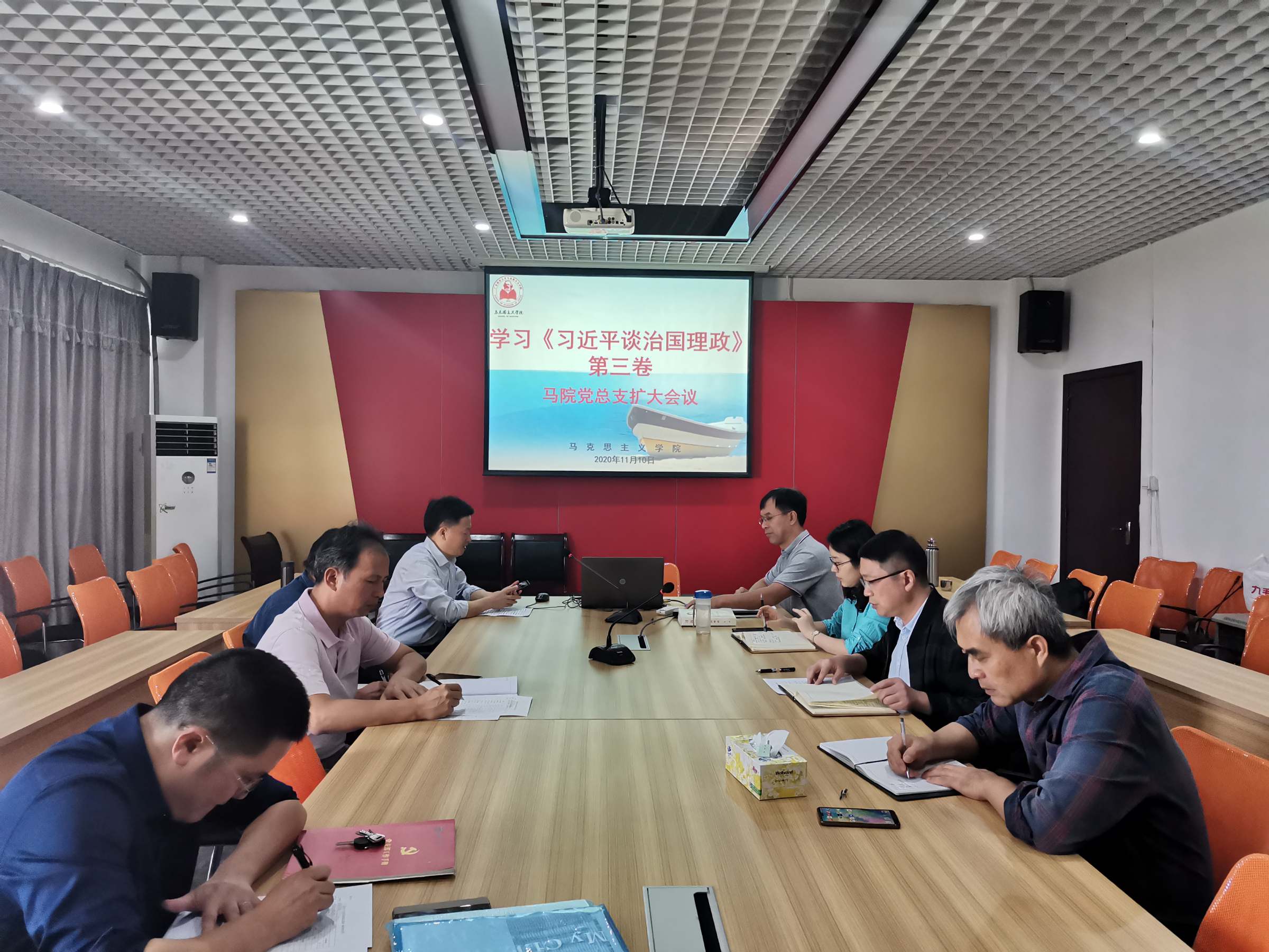 11月10日下午,马克思主义学院党总支召开扩大会议,集体学习《习近平谈治国理政》第三卷。学院党总支委员、教工支部书记和教研室主任共13人参加。学院党总支书记杜奋根主持集体学习。