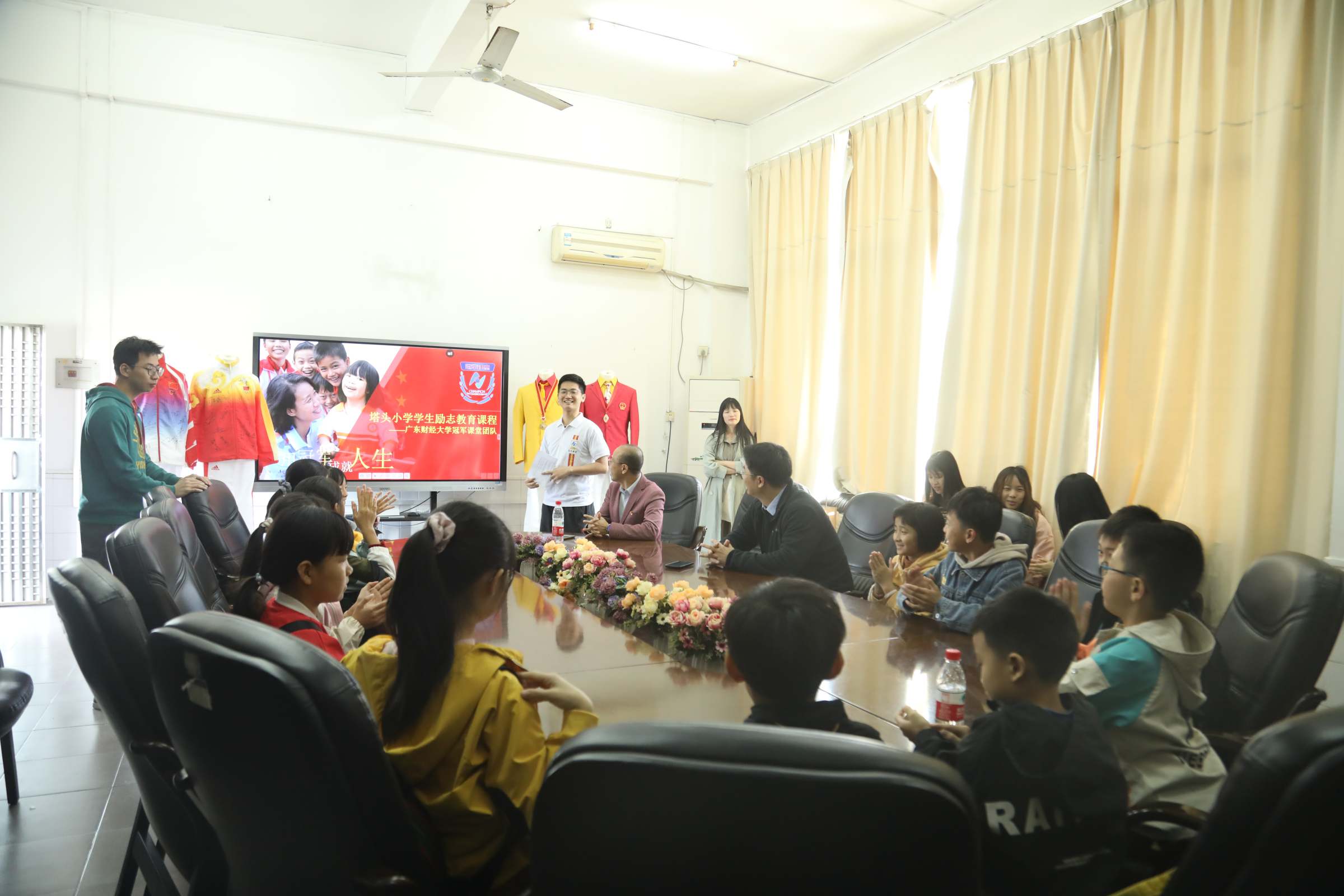 郑贤操讲话。他对塔头小学合唱团获邀参加中国国际儿童电影展表示祝贺。他指出,广财大自2016年对口帮扶揭西塔头村以来,得到了驻地党委政府大力支持,在产业项目建设、乡村风貌提升、挖掘乡村发展潜力、消费扶贫活动开展、基层党组织建设、社会资源引入、治理维稳参与以及扶志扶智落实民生工程方面均取得了较大成效。值此全国决战决胜脱贫攻坚,全面建成小康社会之际,广财大迎来了远方的“家里人”—塔头小学合唱团一行,倍感亲切。他勉励合唱团的孩子们能够记住在广财大接触的哥哥姐姐们,认真学习,立志远大,努力做一名合格的社会主义建设接班人。