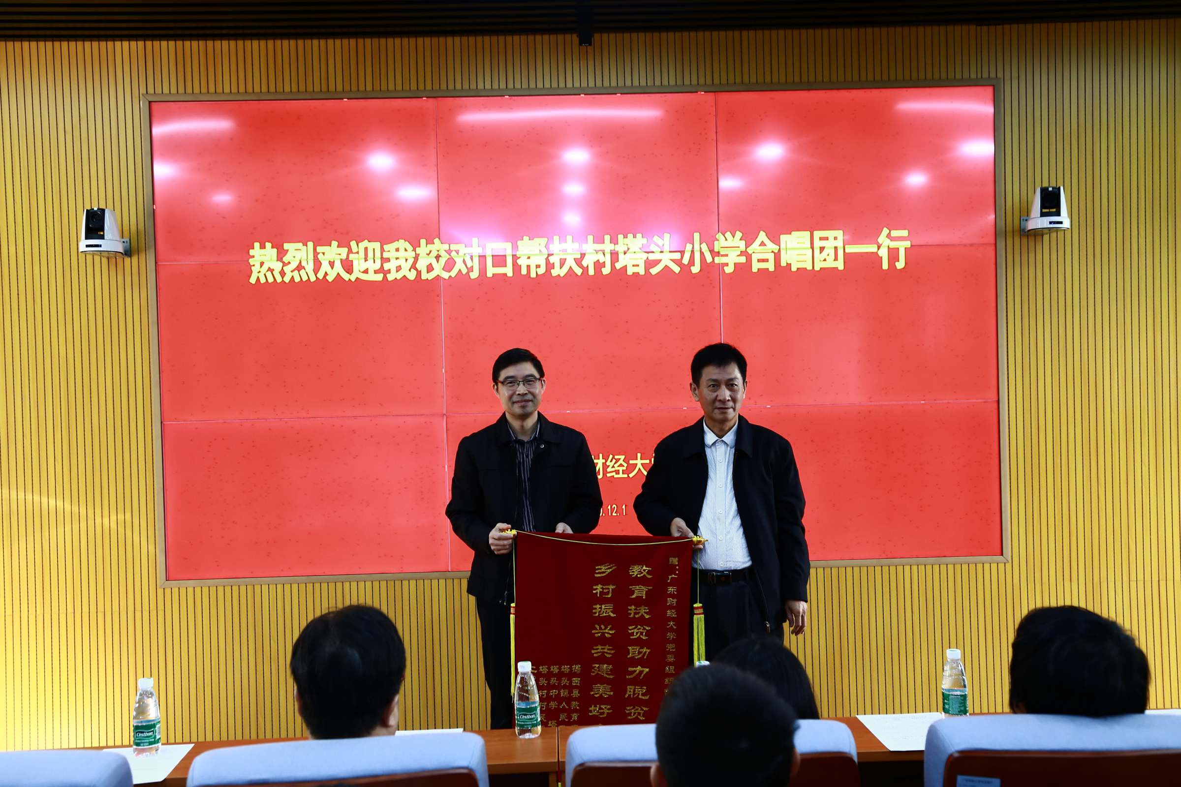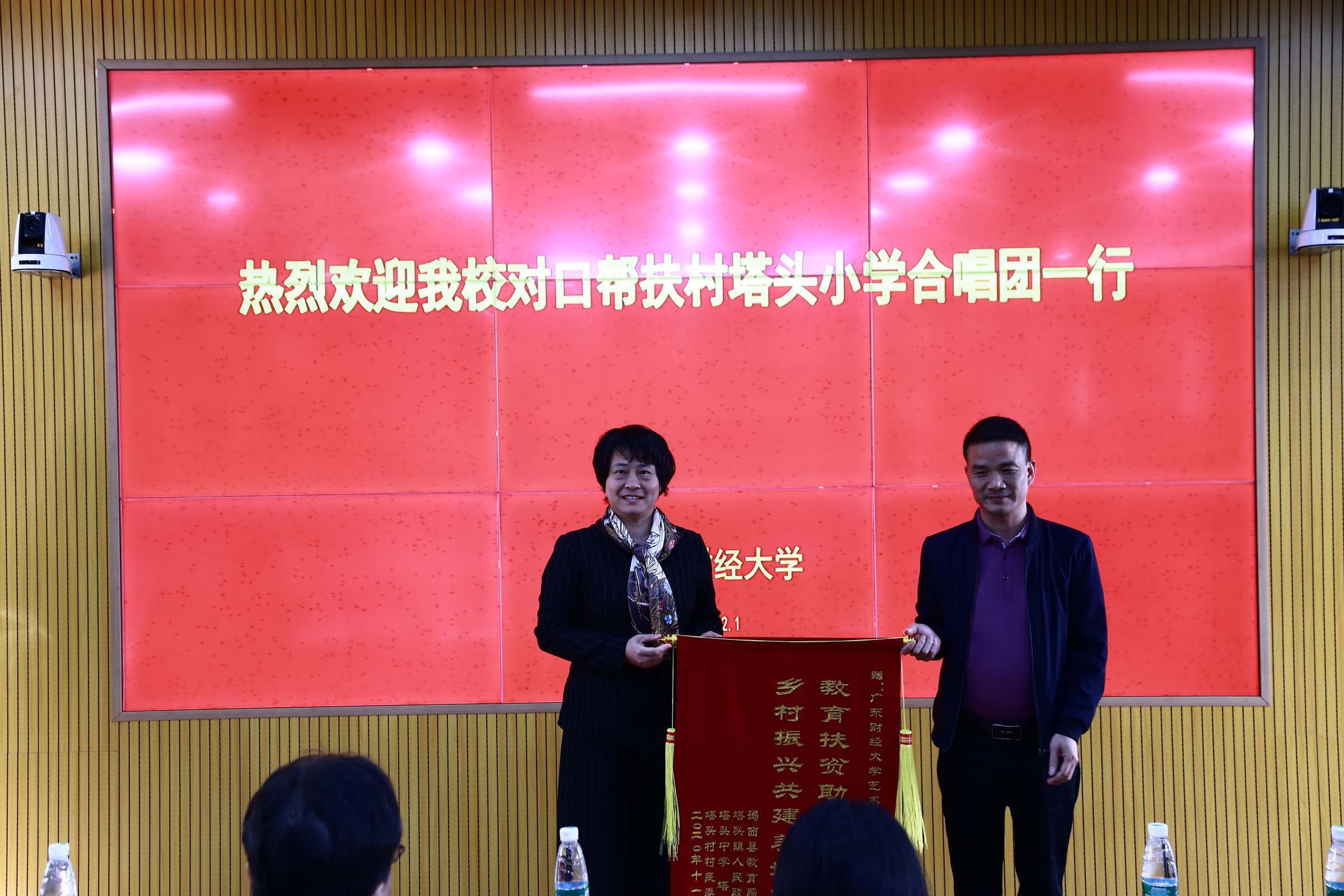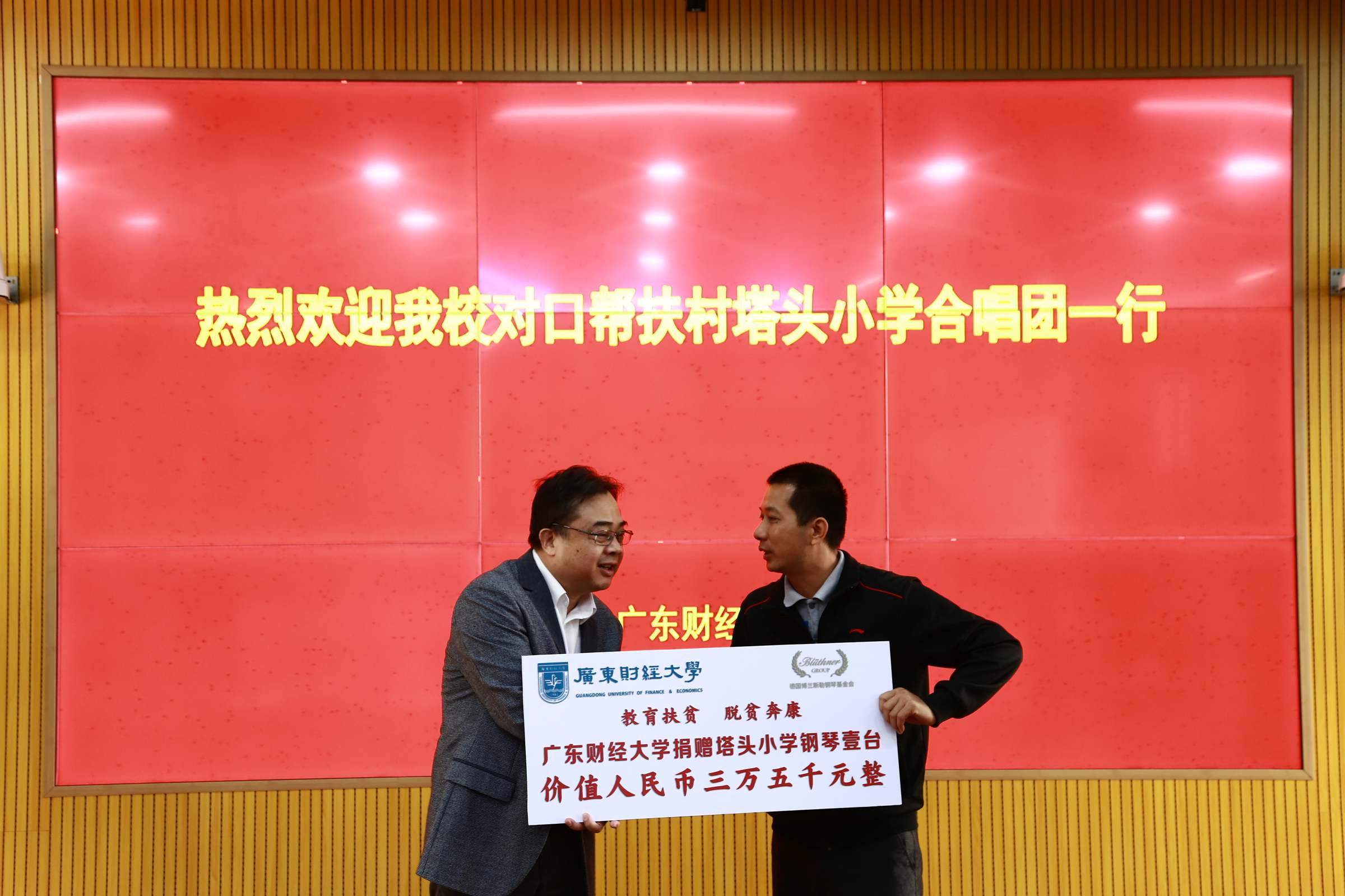 12月1日上午,学校在北四楼经管中心205室会议厅举行欢迎会。会上,举行了学校向塔头小学捐赠钢琴仪式,揭西县、塔头镇相关领导分别向党委组织部、艺术学院赠送锦旗。