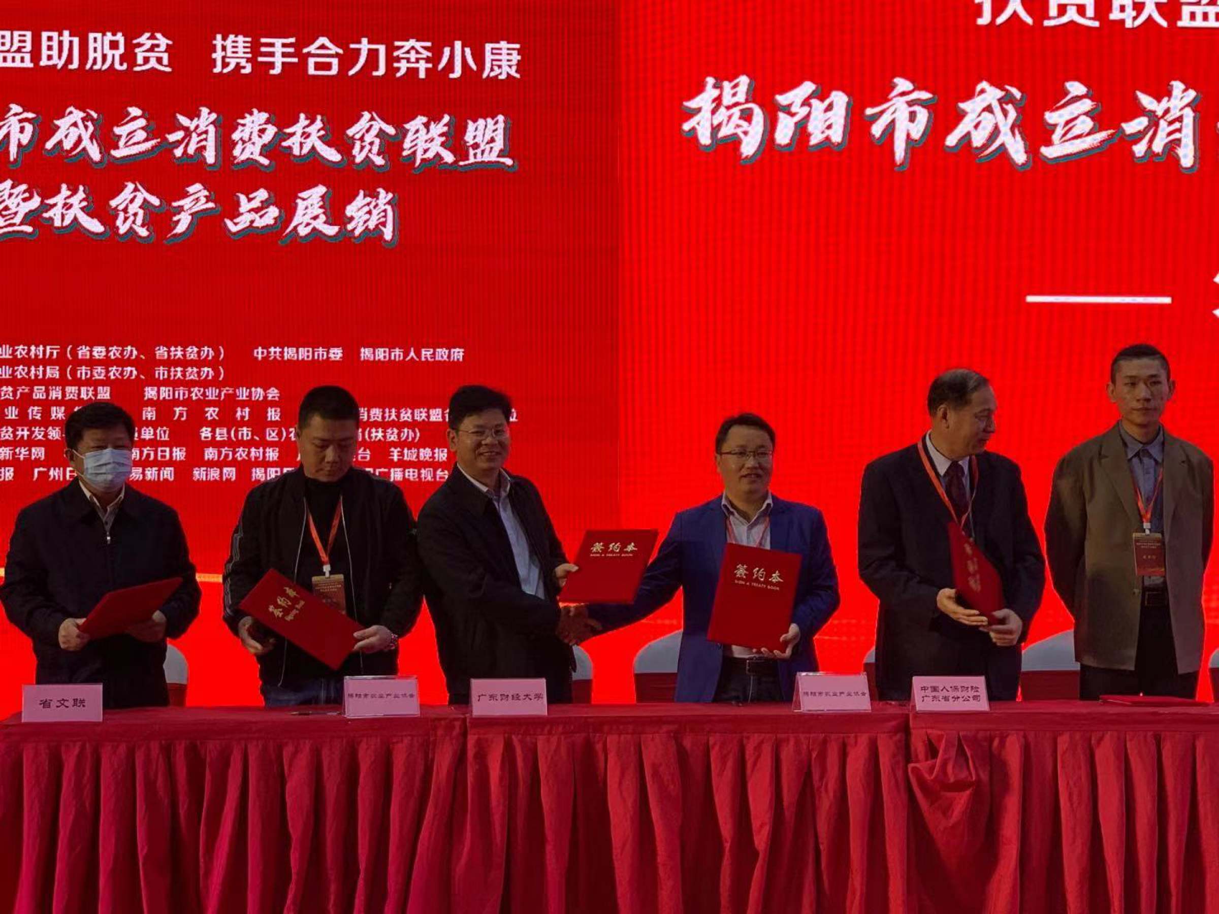 12月7日,揭阳市消费扶贫联盟成立大会(下称“联盟”)暨扶贫产品展销会在广州市荔湾区广东东西部扶贫协作交易市场举行。应中共揭阳市委、揭阳市人民政府邀请,我校作为首批联盟省直成员单位,校党委副书记罗贤甲、驻村工作队队长钟健参加活动。会上,罗贤甲代表学校与揭阳市农业产业协会负责人签订采购意向书。