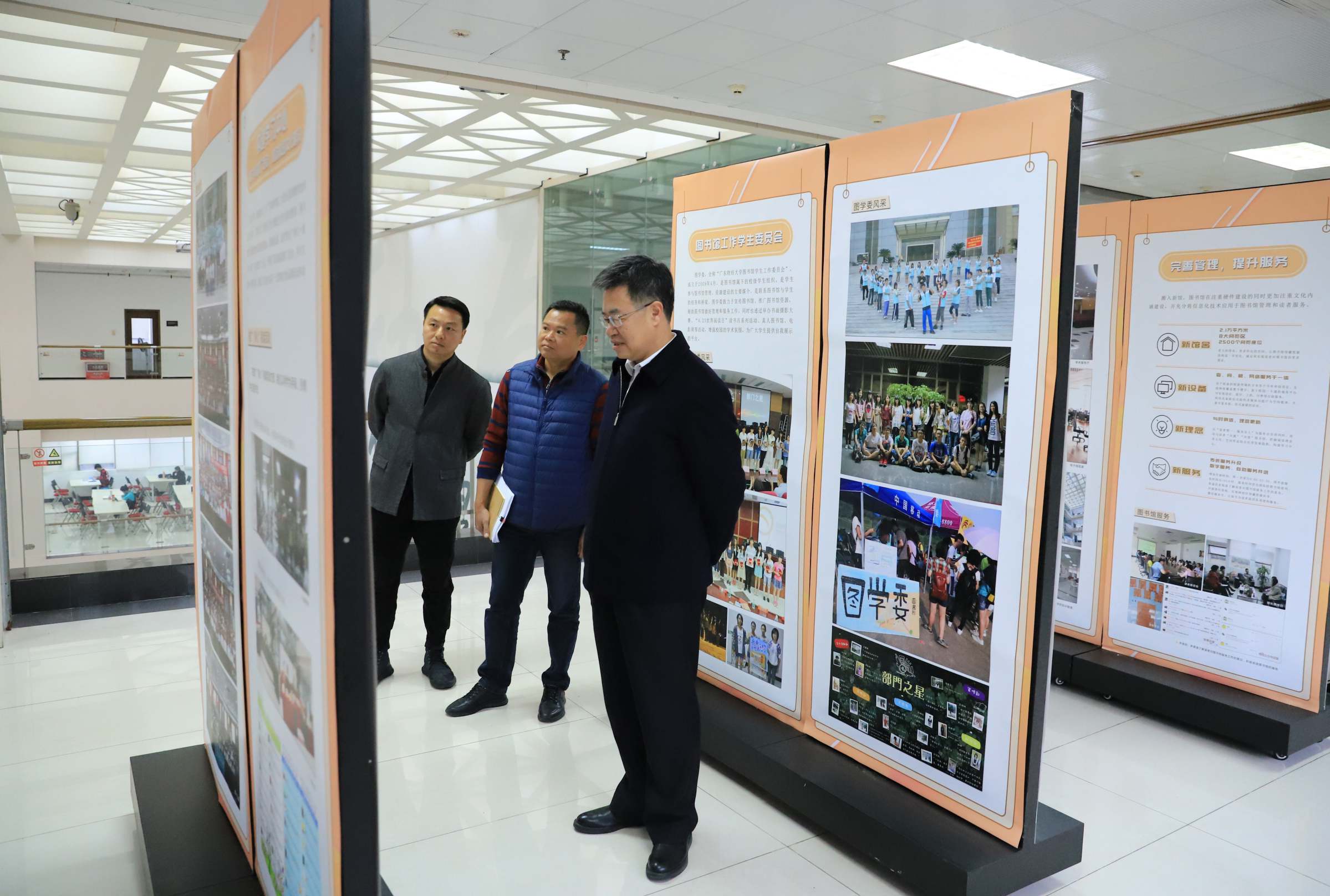 陈国栋一行先后参观了设置于校区图书馆大厅的纪念佛山校区建立20周年图片展和五楼的佛山校区图书馆20周年发展变迁图片展。他仔细观看每一张图片并查阅了相关资料,与陪同参观人员共同回忆图片背后的故事,也分享了自己作为见证者经历的推动校区发展的重要事件。
