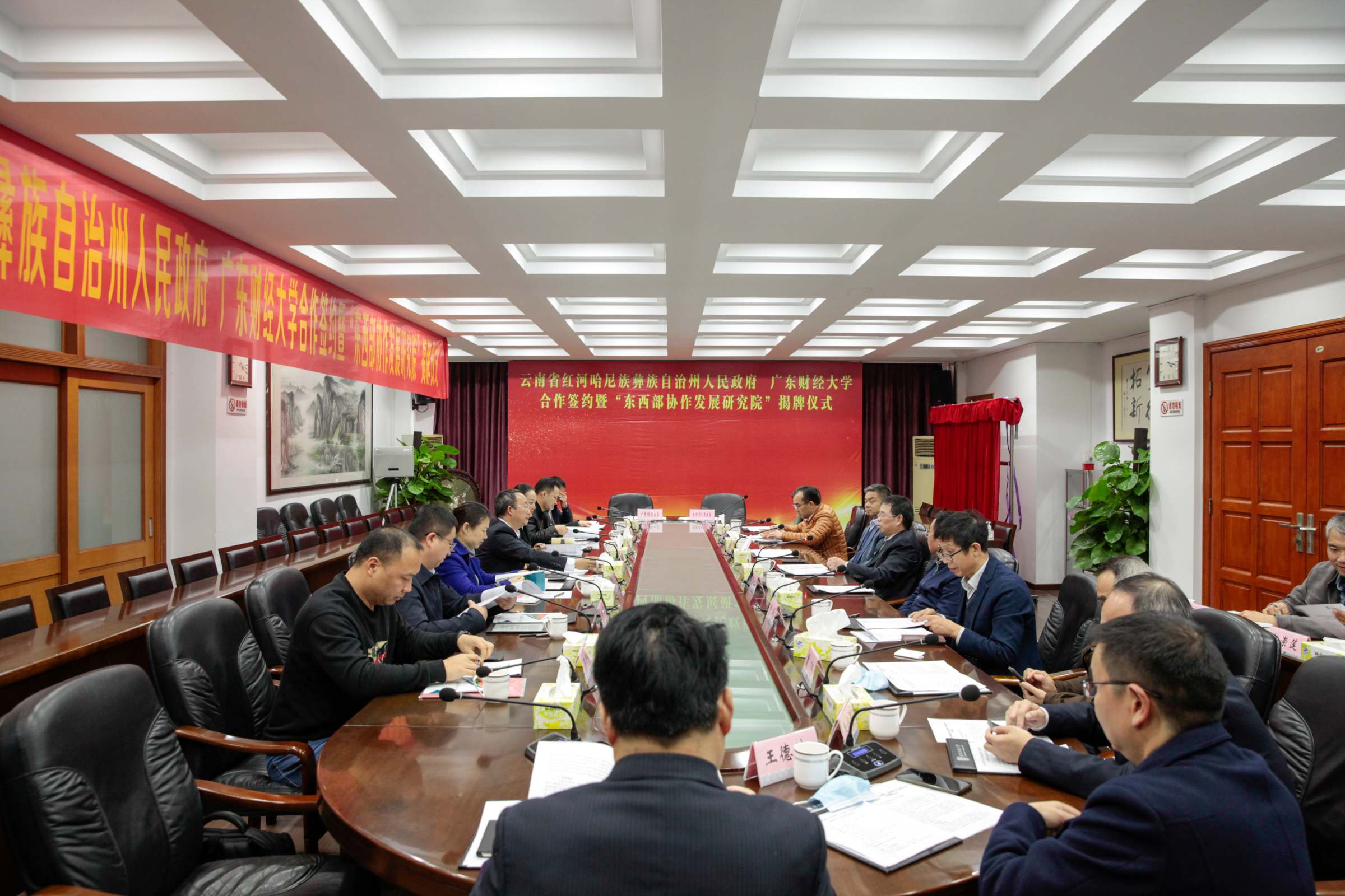 12月25日下午,云南省红河哈尼族彝族自治州人民政府和广东财经大学全面合作工作会议在我校广州校区第一会议室举行。红河州副州长何民、我校副校长邹新月以及州校双方相关部门负责人参加会议。会议由邹新月主持。