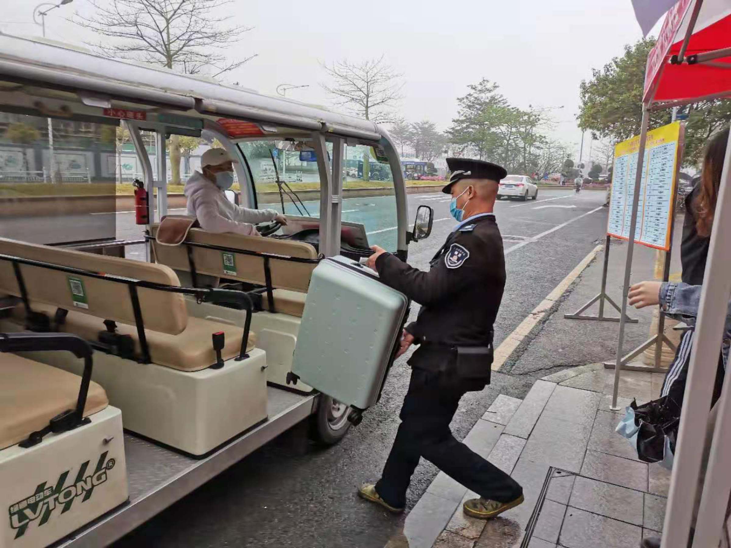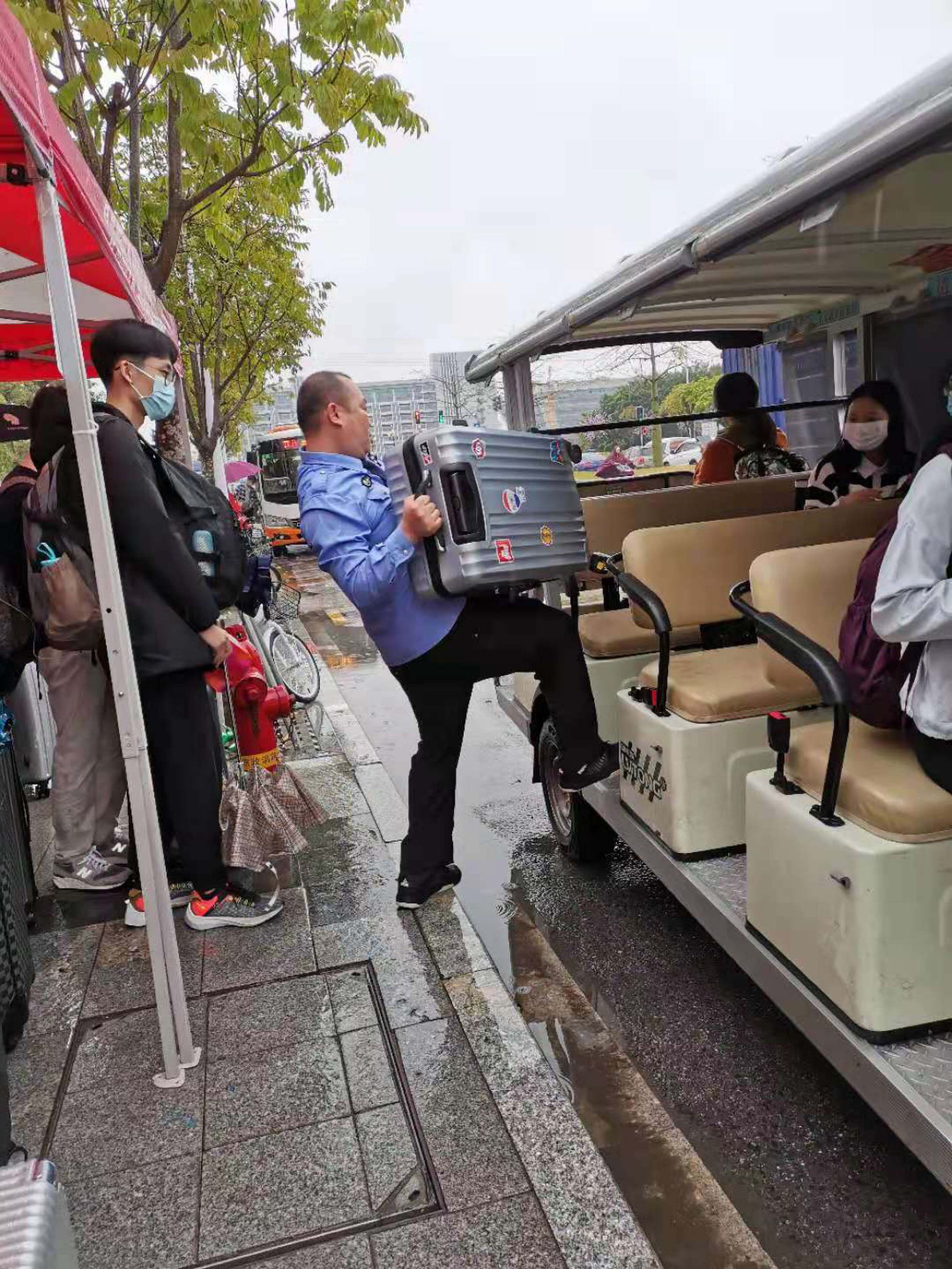 这次学生返校最为独特的风景线,想必是满载学子穿行校内的便民车了。考虑到时下适逢广东梅雨季节,且地铁站离宿舍路途较远,给带着大包小包行李回校的学生增加了不少负担。为减轻学生的返校负担,保卫处引入街道社区电瓶车公交便民服务,开设地铁口到校内学生宿舍电瓶车临时专线。这条专线给返校学生提供了极大便利,学生一出地铁站,马上就有保卫处的工作人员指引,并帮助学生将大件行李箱搬上车,十来分钟就可安全舒适地回到宿舍,既免了避淋雨之苦,又不用承受搬运大件行李之累,返校学生为学校的贴心服务大为赞赏,表示此举让学生感受到了“家”的温暖。
