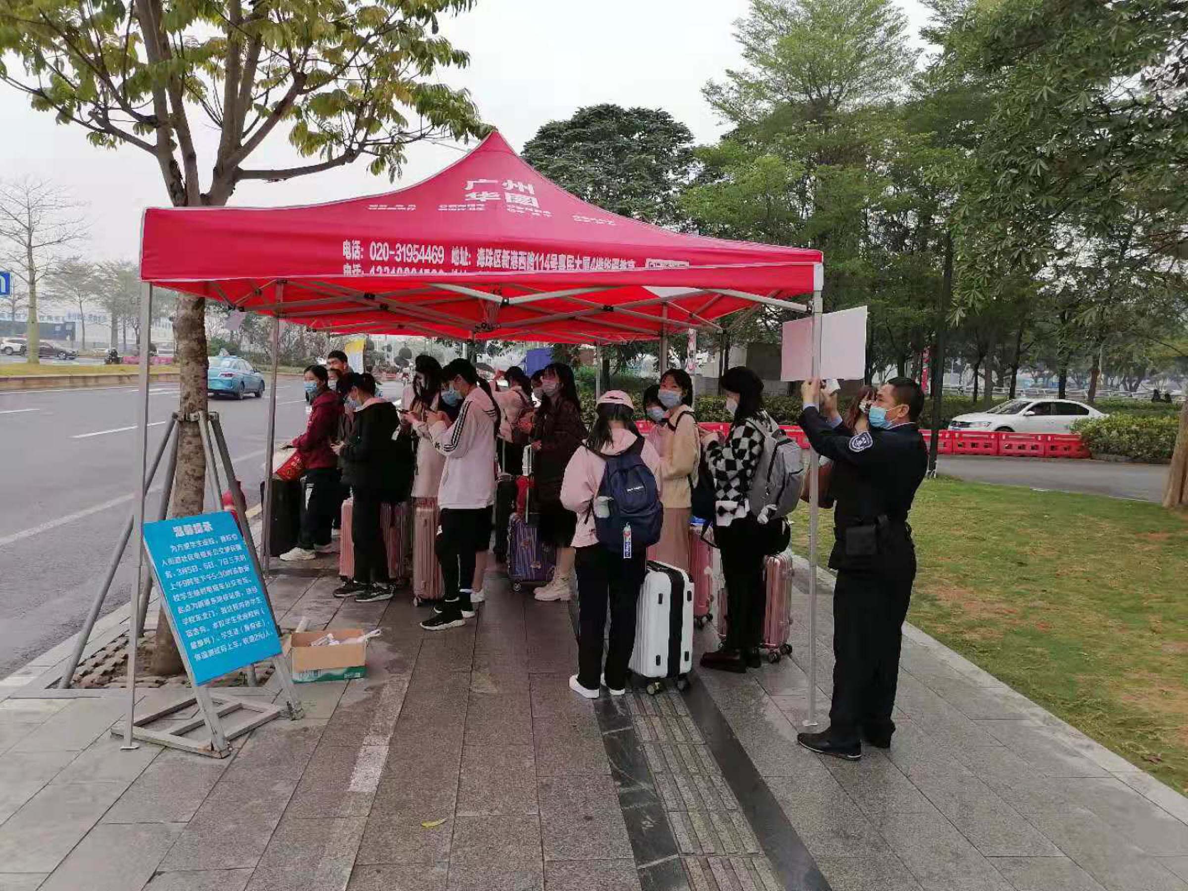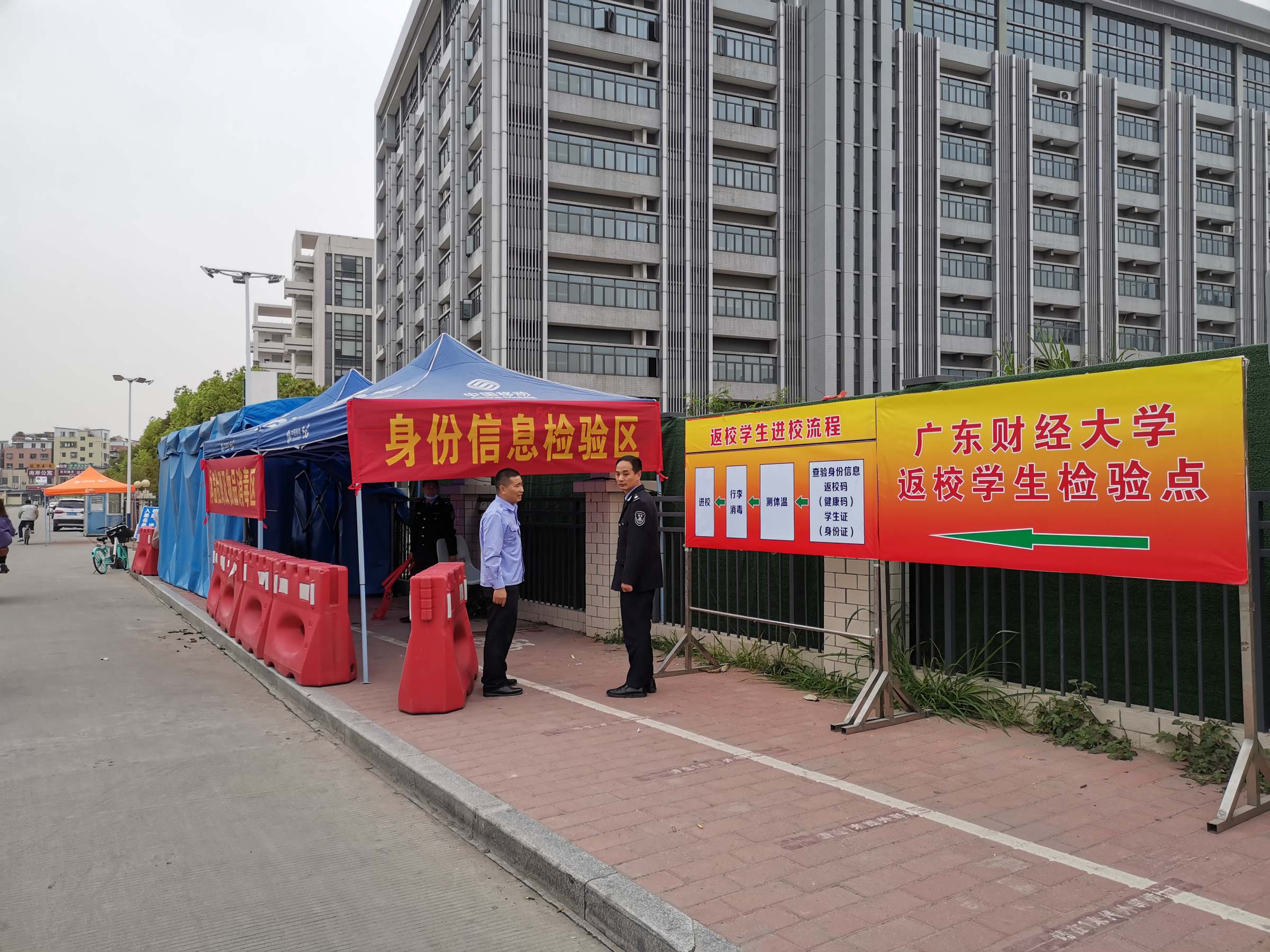 学生返校前几天,保卫处配齐了迎接学生返校的各种防疫物资,包括口罩、手套、防护服、消毒液、探温枪等,快速高效地完成了各类设备的部署和调试,包括测温棚的搭设,隔离留观区、身份信息检验区的帐篷搭设等。为了应对连绵的阴雨天,提升学生们的返校体验,校卫队紧急调来了多顶帐篷,为排队等待的学生遮风挡雨。校内交通方面,增加了雪糕筒的数量并进行了更合理的位置调整,同时加派了更多队员在关键路口疏导交通,保证校内交通有序顺畅。