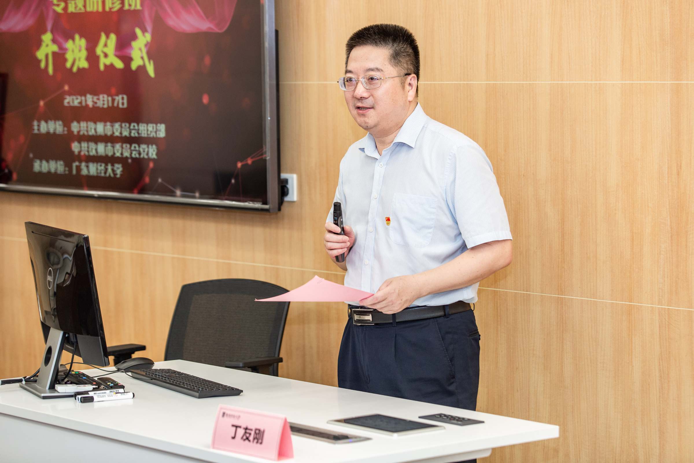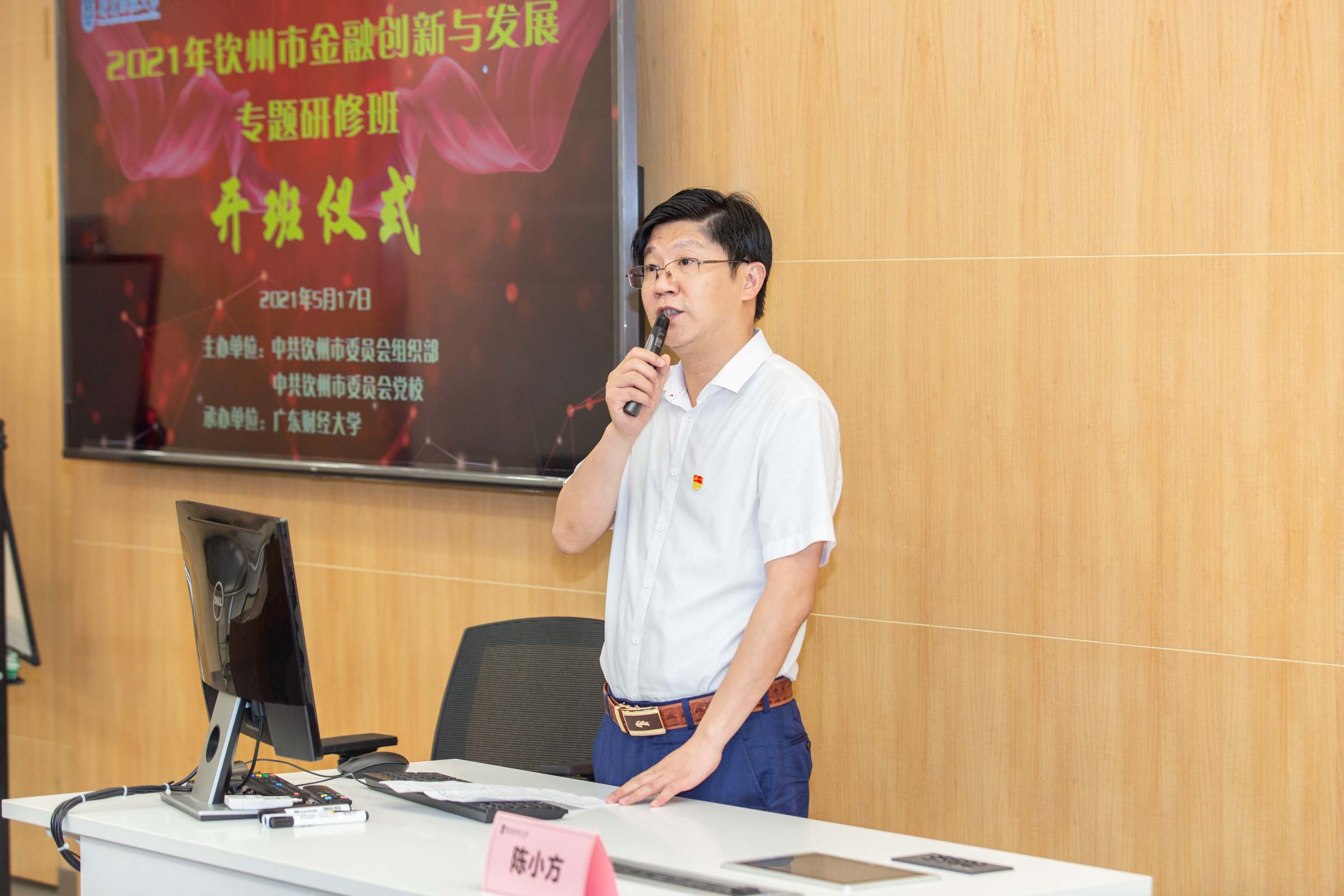 丁友刚致辞,他向学员介绍了学校的发展历程与取得的成绩,并表示本次培训班以“金融创新与发展”为主题展开,这是我校发挥人才和学科专业优势,支持钦州经济社会高质量发展的重要举措。他希望通过本次培训活动,让学员们学有所思、学有所获、学有所用,为广西和钦州的发展贡献自己的力量。