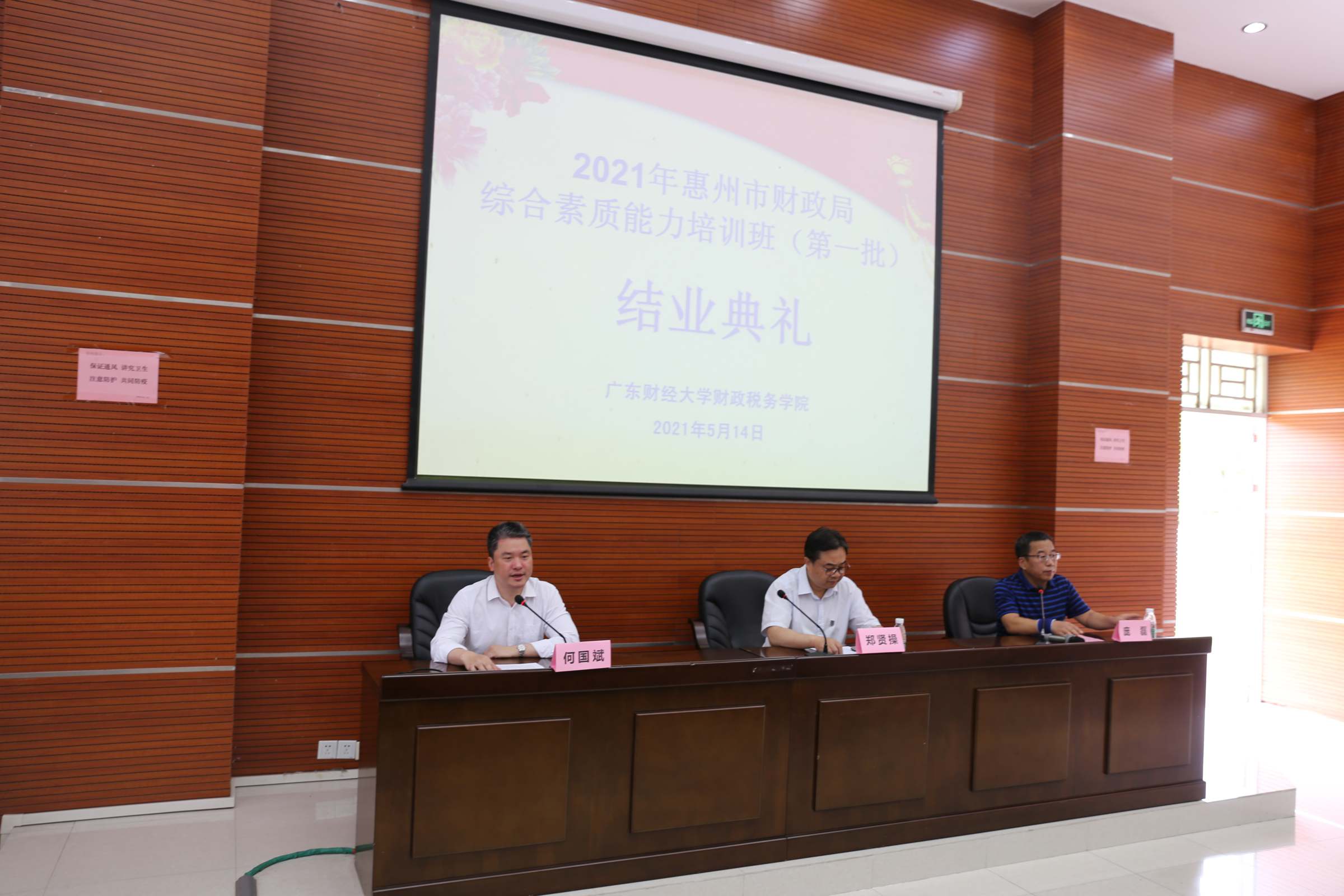 5月14日,为期4天、由我校财政税务学院承办的惠州市财政局综合素质能力培训班圆满结束。校党委书记郑贤操,惠州市财政局党组书记、局长何国斌,财政税务学院院长庞磊以及45名学员参加结业典礼。