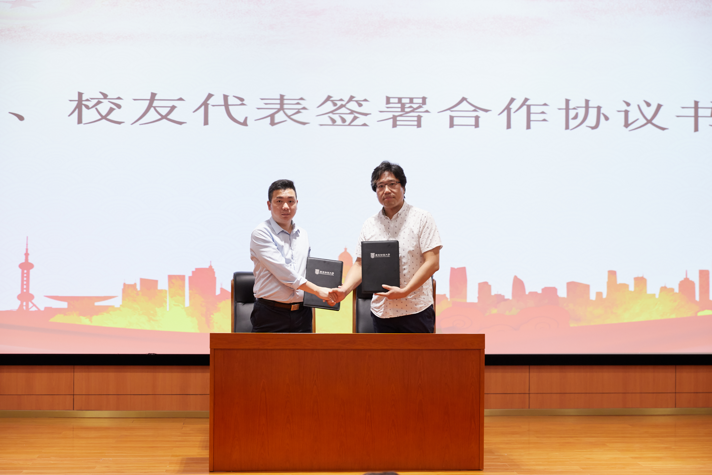 院长杜肇铭介绍“文创服务发展研究中心”的成立情况,期待在学院和校友们的共同努力下将中心打造成一个有社会影响力、有价值输出、有沉淀积累的创新服务平台。郑鲁豪校友表示将以学院为依托,以中心为平台和广大校友一起共同探索、研究文化创意的多元化服务模式,致力于新文创新服务的发展研究,将中心打造成校友与学院深度链接的重要桥梁之一,为携手发展提供有力支撑。