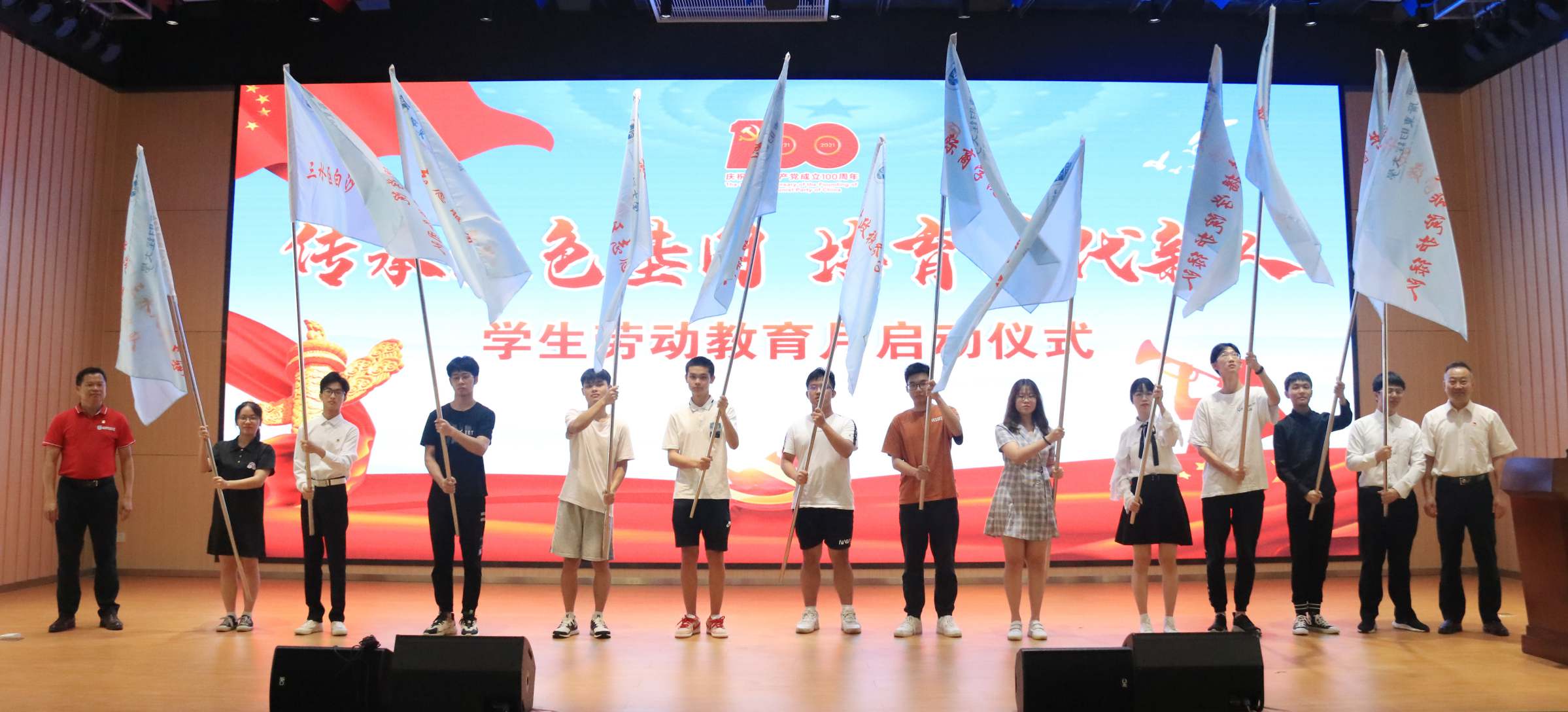 王伟向12个学生劳动教育服务队代表授旗。公共管理学院三水区白沙村安老志愿服务团队代表黎庆奔分享了团队开展的志愿服务。