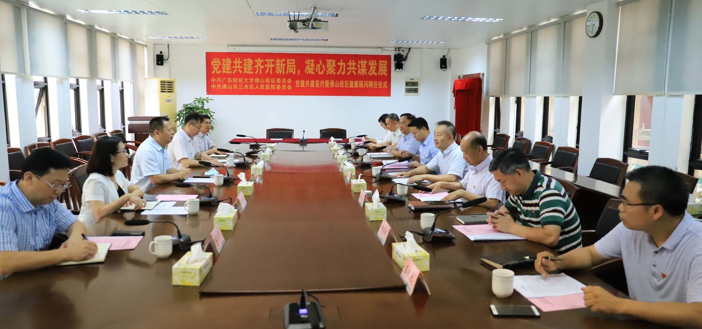 为迎接建党100周年,进一步加强基层党建工作,5月20日上午,佛山校区党委与佛山市三水区人民医院党委举行了党建共建签约暨佛山校区健康顾问聘任仪式。三水区人民医院党委书记徐志明、副书记蔡敏、医院相关部门和科室同志,我校佛山校区党政领导、党委委员及有关部门负责人参加了会议。会议由佛山校区党委副书记钟智主持。
